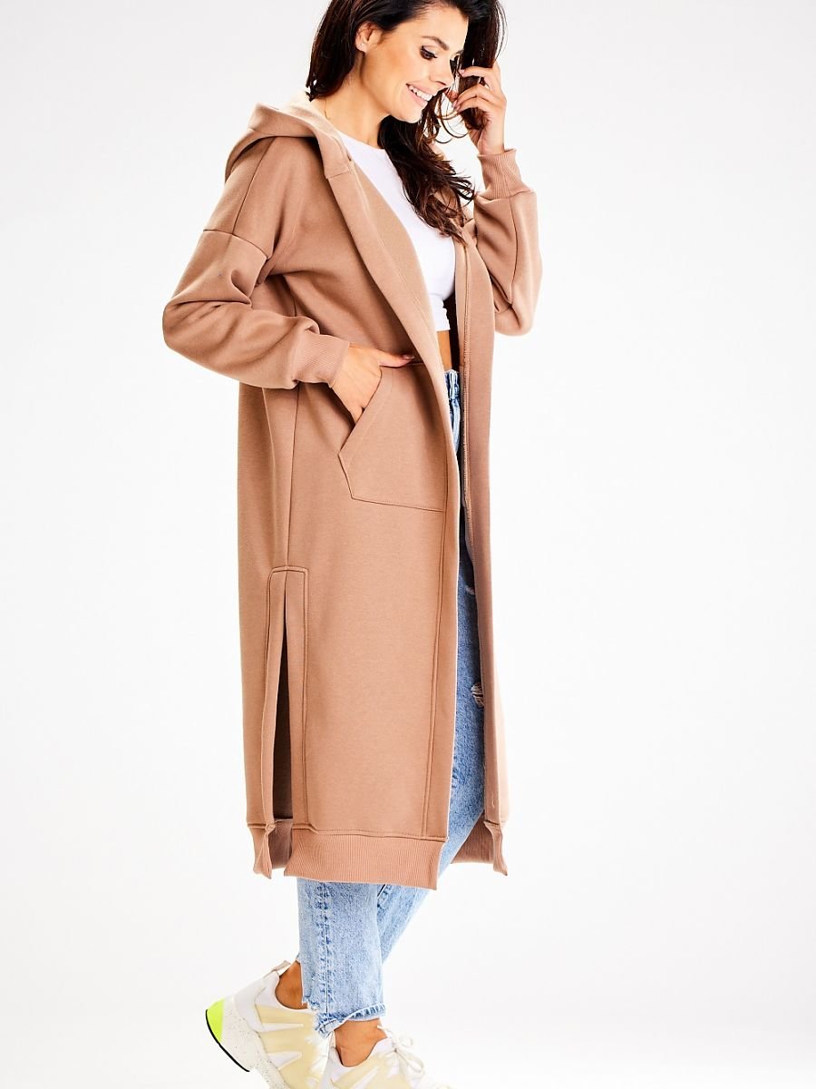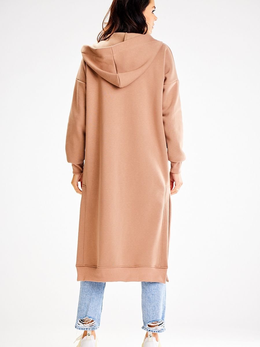 Długa, luźna bluza bez zapięcia, z rozcięciami na bokach, kapturem oraz kieszeniami na przodzie przodu.