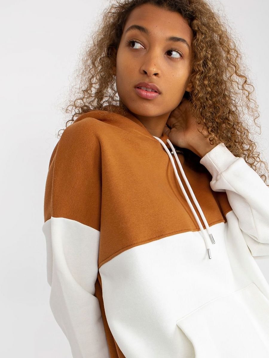 Dwukolorowa bluza damska z długim rękawem oraz kapturem. Na przodzie kieszonka typu kangurek.