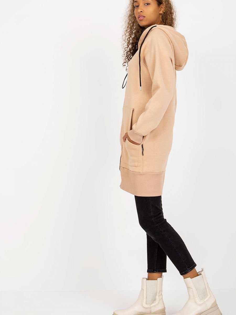 Bluza damska o przedłużonym kroju, z długim rękawem. Bluza z kapturem, zapinana na zamek. Po bokach kieszenie wsuwane.