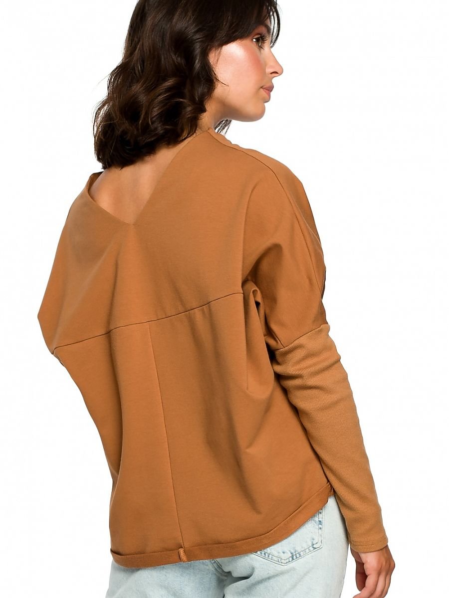 Bluza damska o luźnym kroju z rękawami zakończonymi długim ściągaczem, pod szyją drapowany dekolt i lekko wycięty dekolt z tyłu. Swoboda i modny styl.