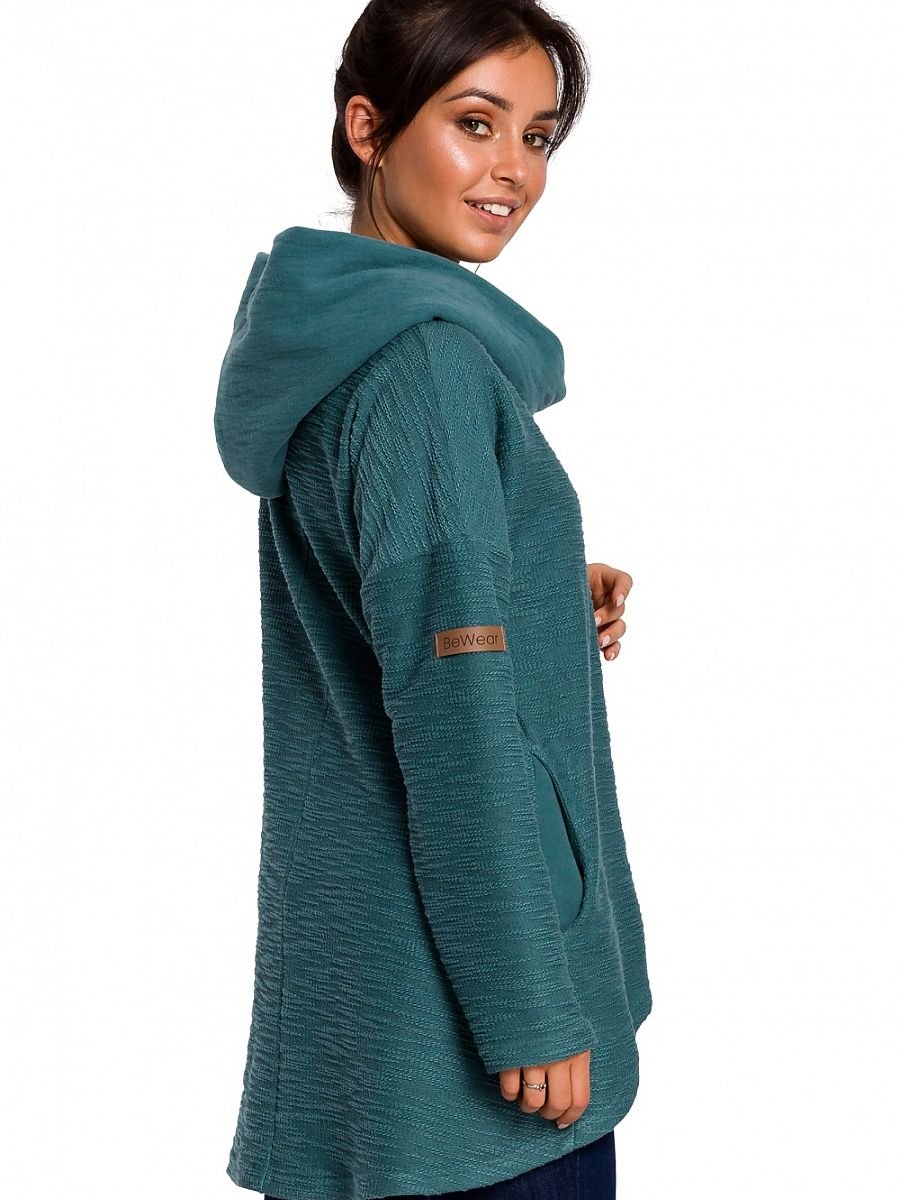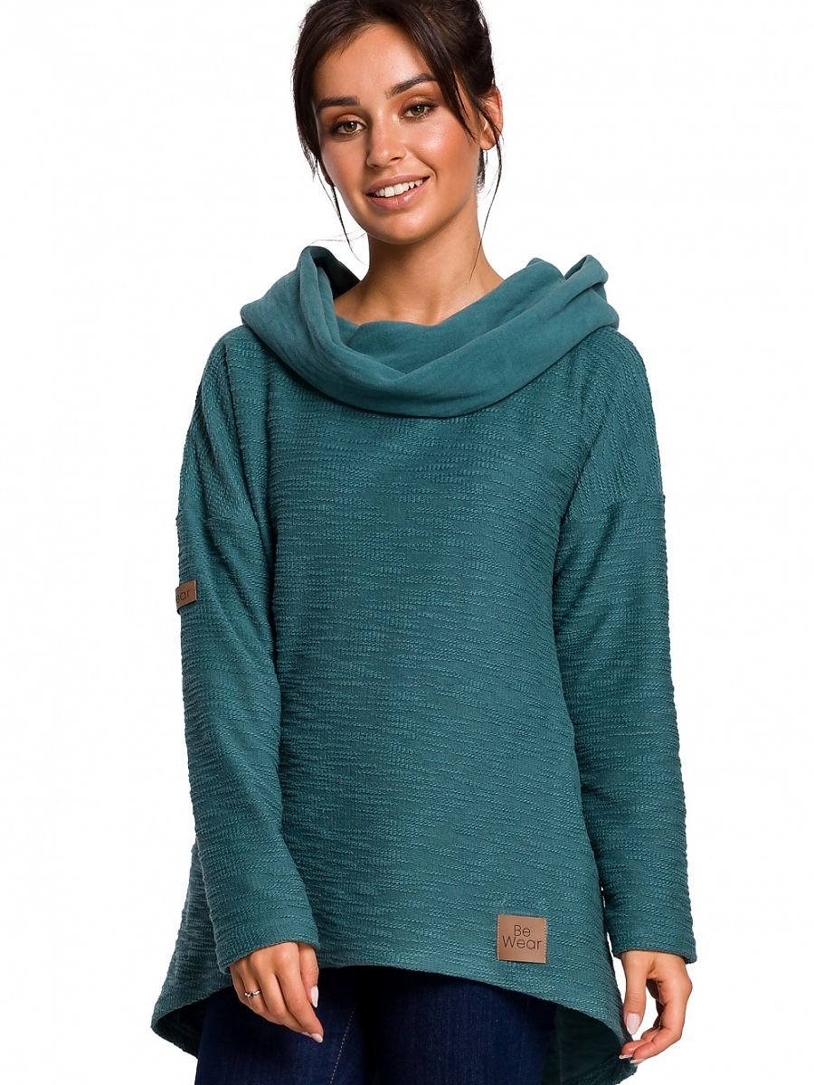 Bluza o swobodnym, asymetrycznym fasonie z kieszeniami. Idealna na chłodniejszą porę. Z przodu luźny komin oraz obszerny kaptur z tyłu pozwolą Ci poczuć się ciepło i przytulnie. Dodatkowym walorem jest dwustronna dzianina niezwykle miękka i ciepła o różnych strukturach.