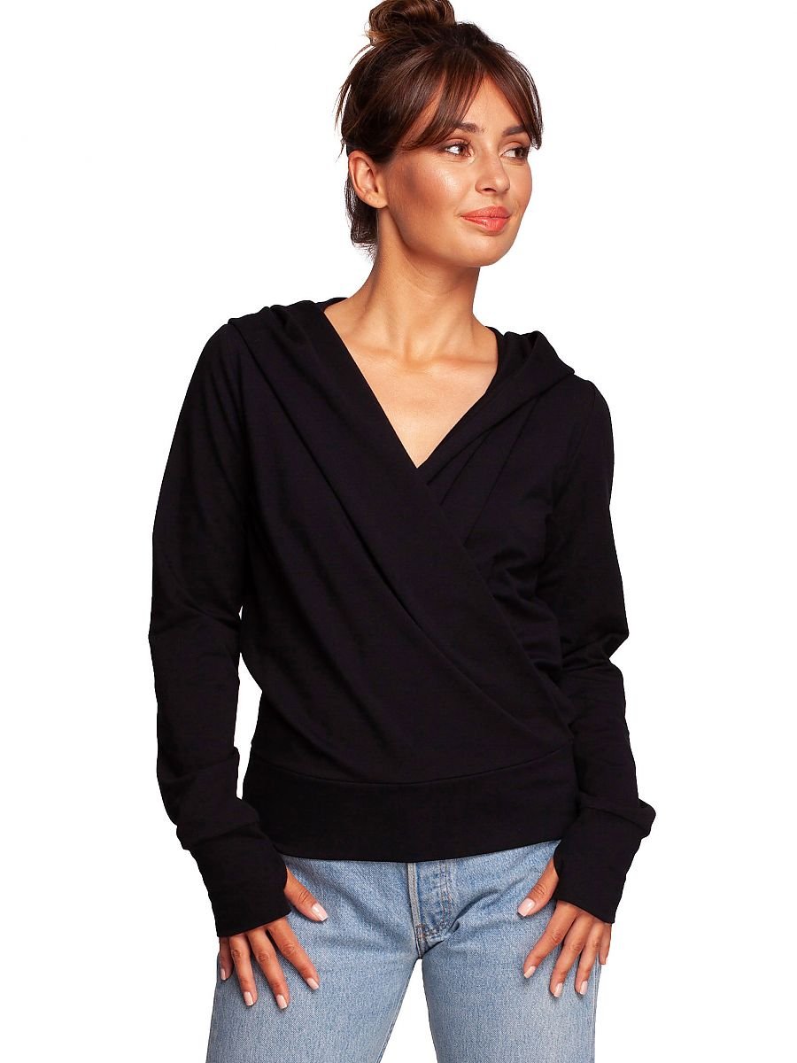 Bluza o nieco innym obliczu elegancka, o kroju kopertowym z drapowaniem i kapturem, a do tego wąskie rękawy z wycięciem na kciuk w mankietach.