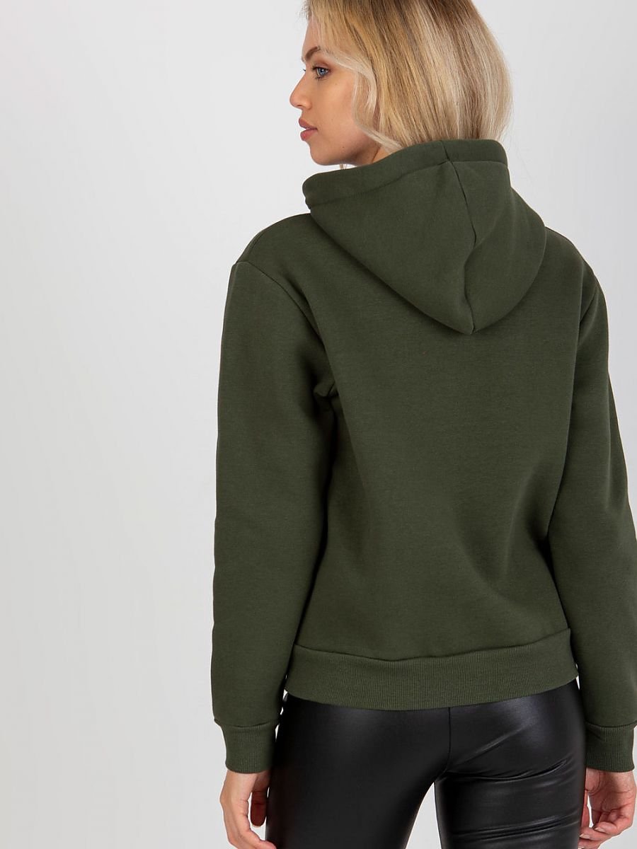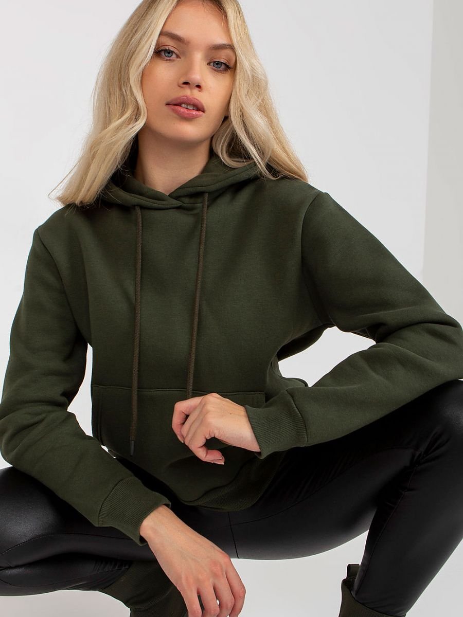 Bluza damska z długim rękawem oraz kapturem. Na przodzie kieszonka typu kangurek.