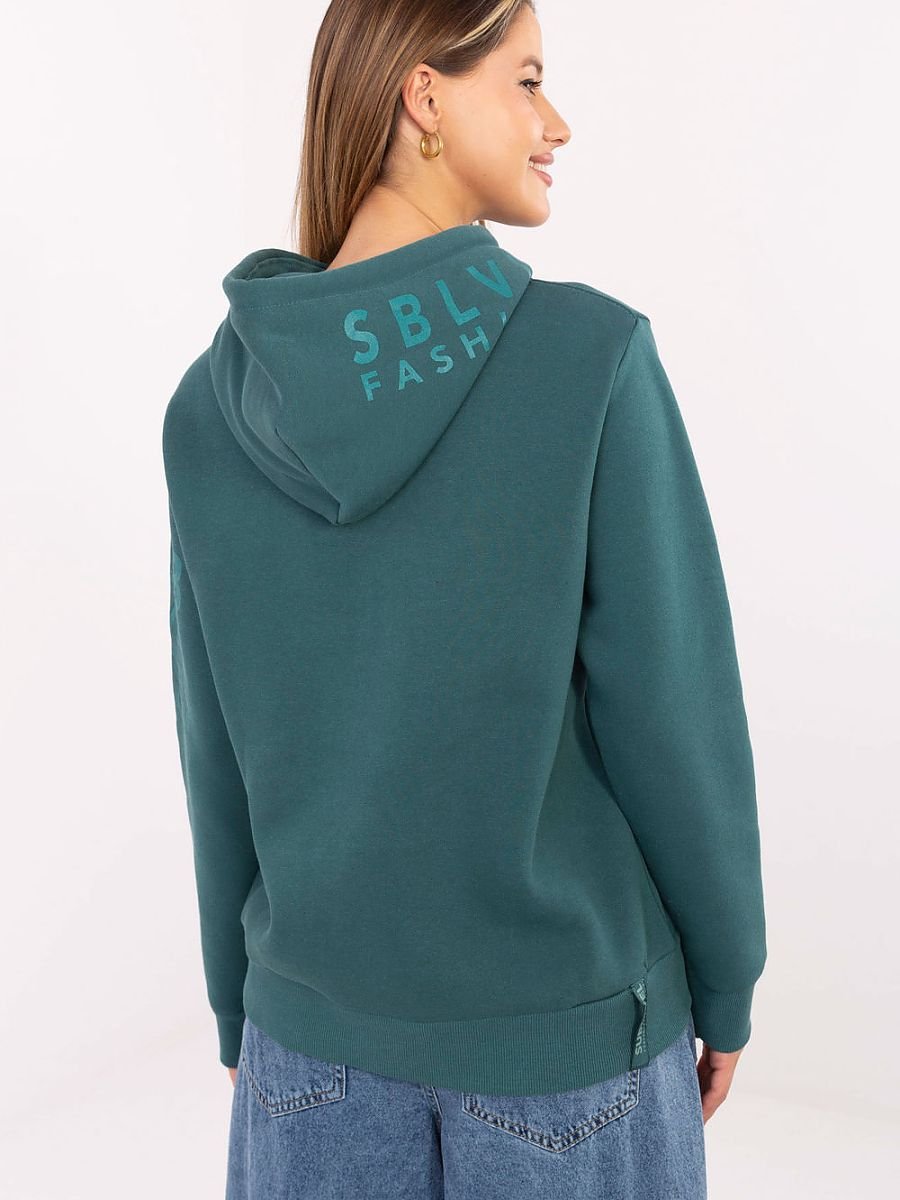 Damska bluza o casualowym charakterze, stworzona z myślą o codziennym komforcie i modnym wyglądzie. Wykonana z przyjemnej w dotyku mieszanki bawełny i poliestru, zapewnia wygodę oraz trwałość. Model o standardowej długości z długim rękawem, kapturem oraz praktycznymi troczkami do wiązania, pozwalającymi na indywidualne dopasowanie. Bluza nie posiada zapięcia, co podkreśla jej swobodny styl. Na przodzie znajduje się kieszeń typu kangurek, idealna do ogrzania dłoni lub przechowywania drobiazgów. Dodatkowym atutem są subtelne nadruki na rękawie i kapturze, które dodają charakteru, nie zaburzając przy tym gładkiego wzoru całości. Ciepła, stylowa i funkcjonalna, świetnie sprawdzi się w codziennych stylizacjach przez cały sezon.