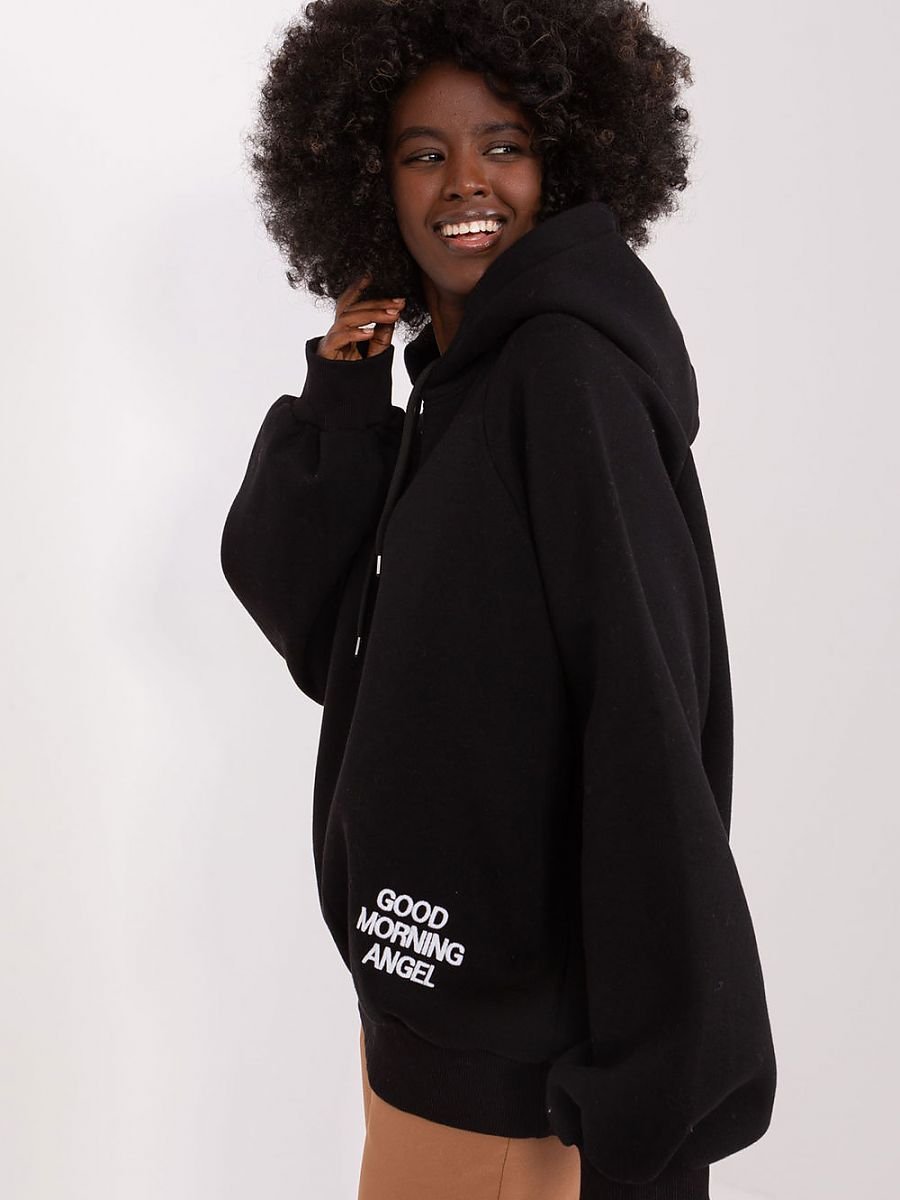 Ocieplana bluza damska o luźniejszym kroju, z długim rękawem oraz kapturem. Na przodzie ozdobny mały napis. Propozycja idealna na co dzień i nie tylko.