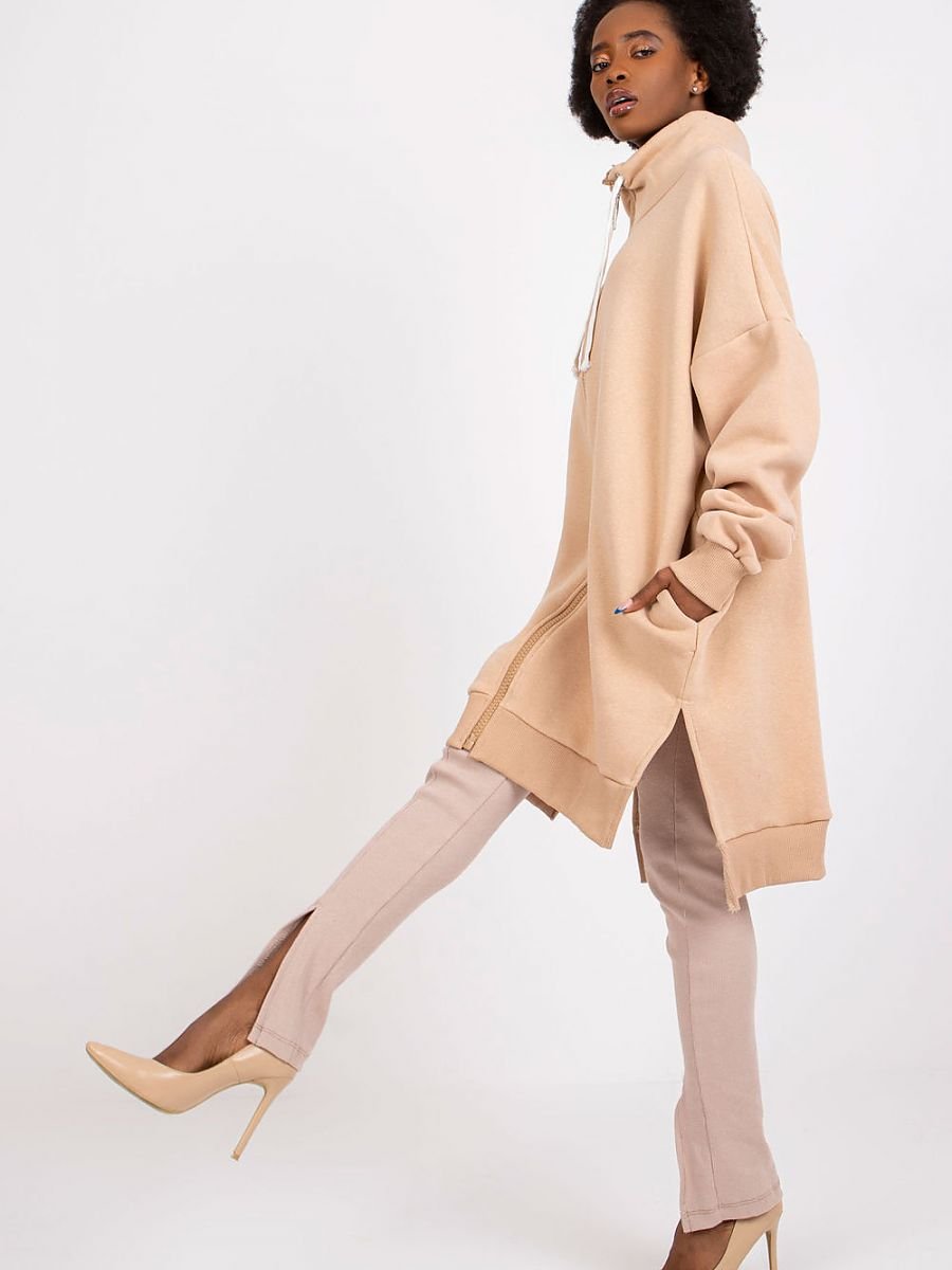 Bluza damska o przedłużanym kroju, zapinana na zamek. Bluza z długim rękawem oraz wysoką stójką. Po bokach rozcięcia, kieszenie w szwach bocznych.