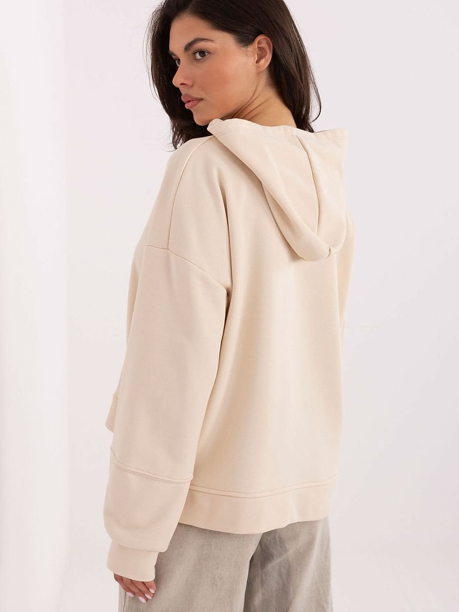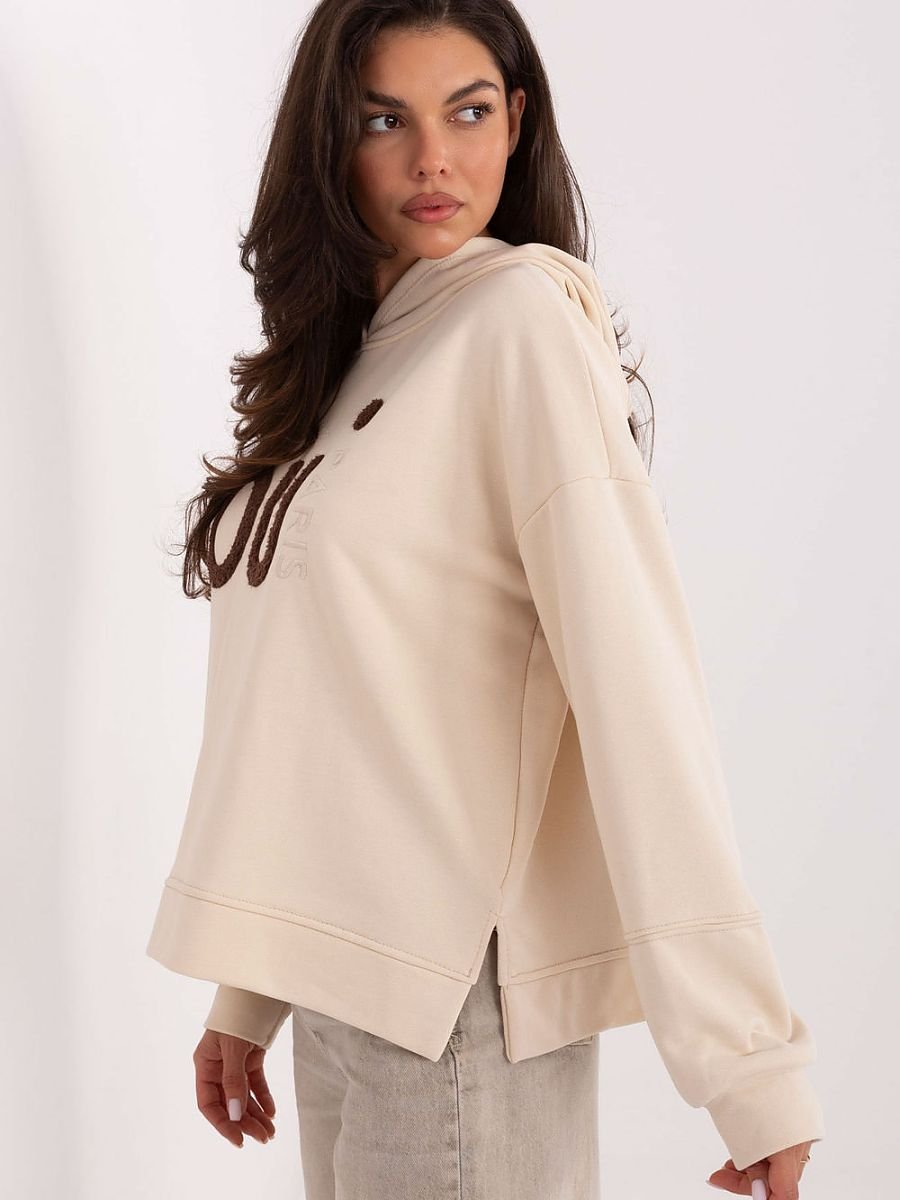 Casualowa bluza damska o standardowej długości, idealna na codzienne stylizacje. Wykonana z wysokiej jakości bawełny z domieszką poliestru, jest miękka, przyjemna w dotyku i trwała. Model z długim rękawem oraz praktycznym kapturem. Przód zdobią modne hafty i napisy, które nadają bluzie charakteru i oryginalności. Po bokach, u dołu, znajdują się subtelne rozcięcia, które zwiększają komfort noszenia i dodają nowoczesnego wyglądu. Świetny wybór na co dzień łączy wygodę, funkcjonalność i modny design.