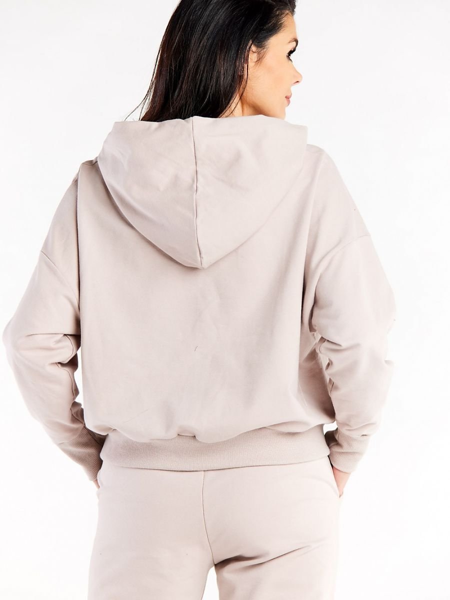 Luźna bluza z długim rękawem, kapturem oraz ozdobnym szwem na przodzie. Na przodzie duża kieszonka typu kangurek.