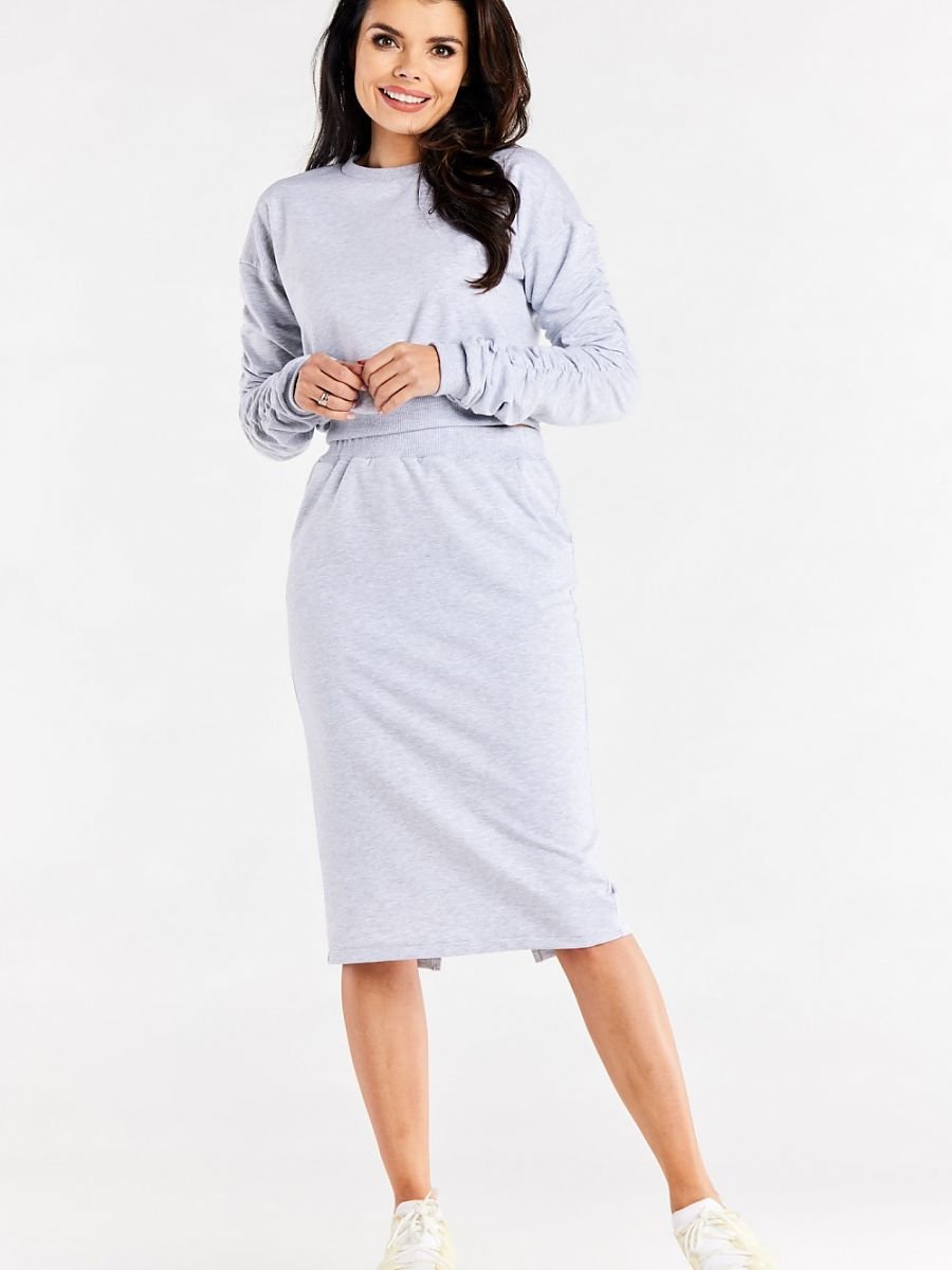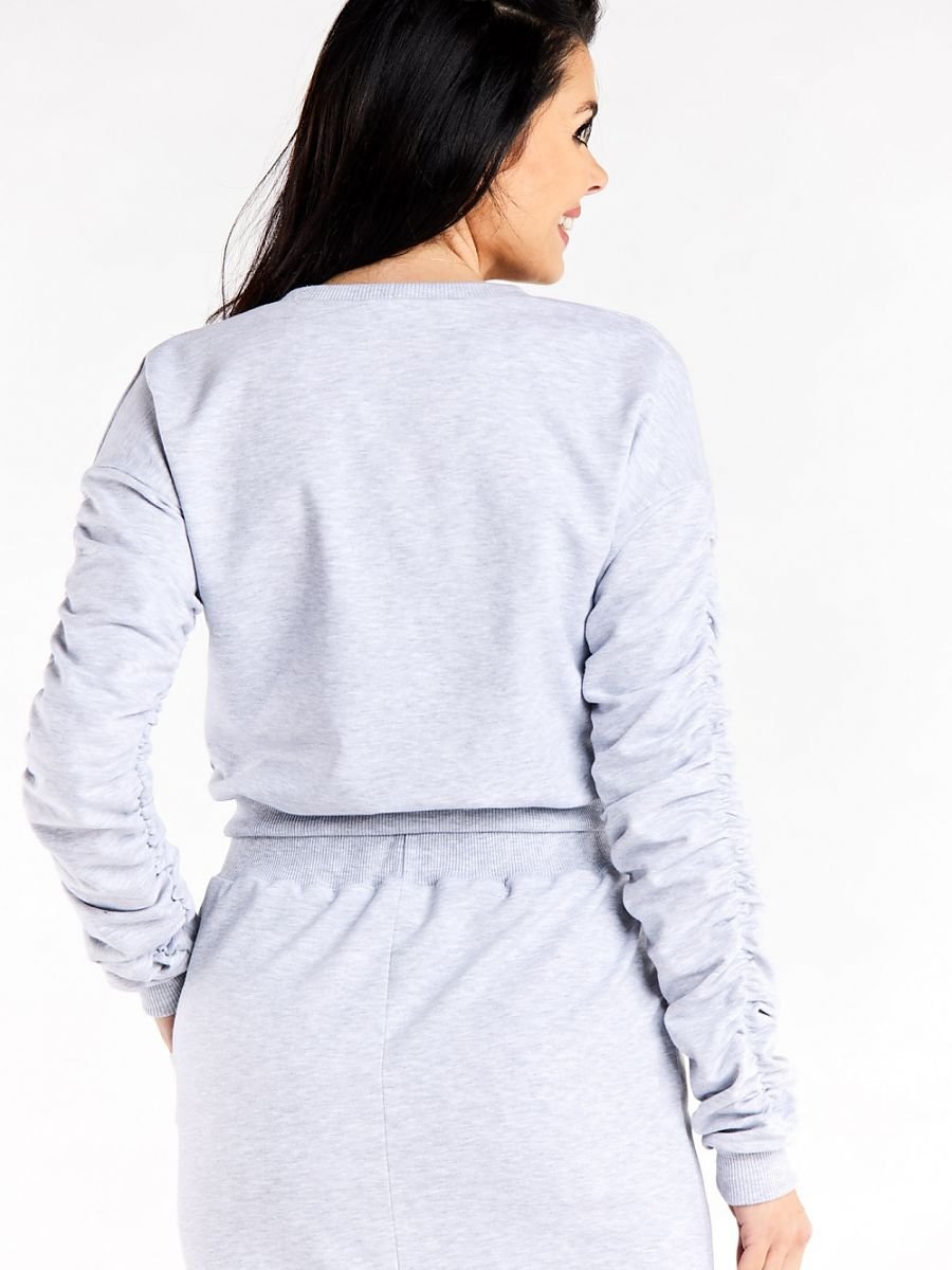 Krótka bluza damska z długim rękawem oraz okrągłym dekoltem. Rękawy z ozdobnymi marszczeniami.