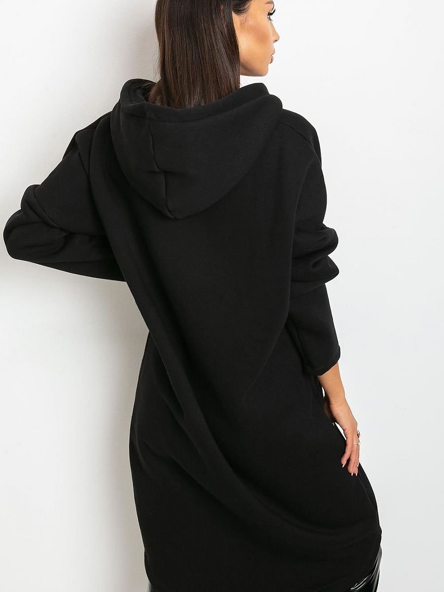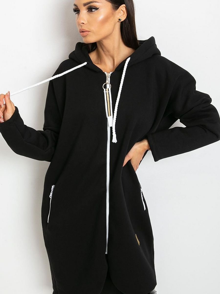 Bluza damska o przedłużonym kroju, z długim rękawem oraz kapturem. Bluza zapinana na zamek, po bokach kieszenie wsuwane również zapinane na zamki.