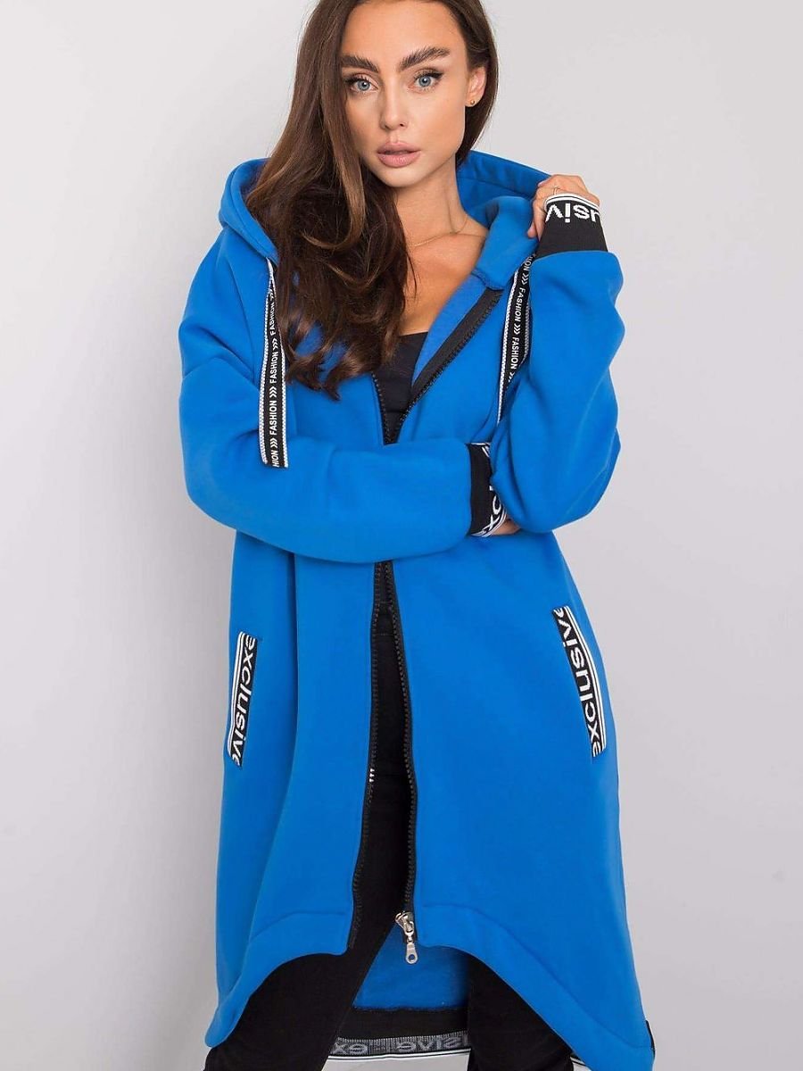 Ciemnoniebieska bluza damska przedłużana zapinana na zamek. Bluza posiada kaptur i kieszenie wsuwane.
