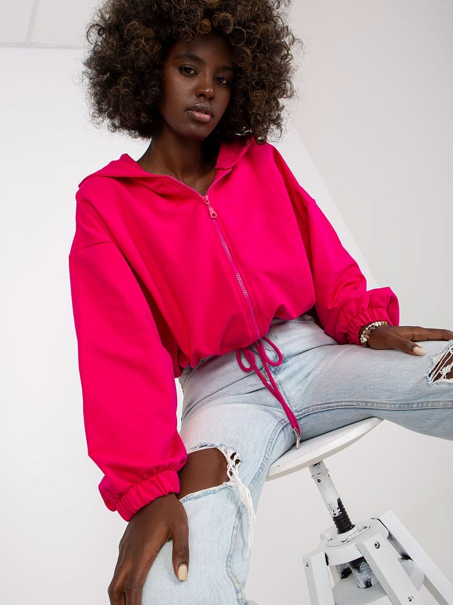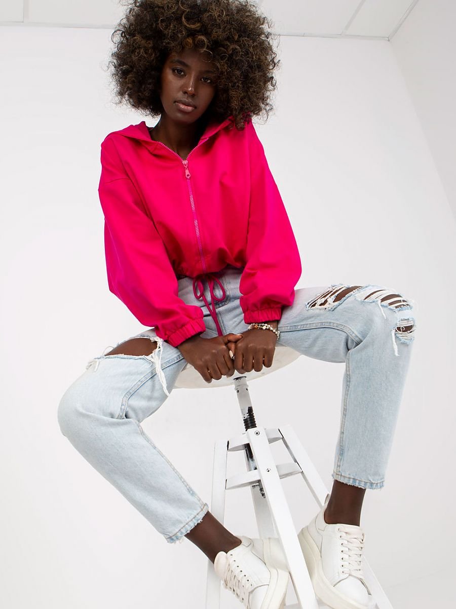 Krótka bluza damska z długim rękawem, zapinana na zamek. Bluza z kapturem, u dołu troczki do wiązania.