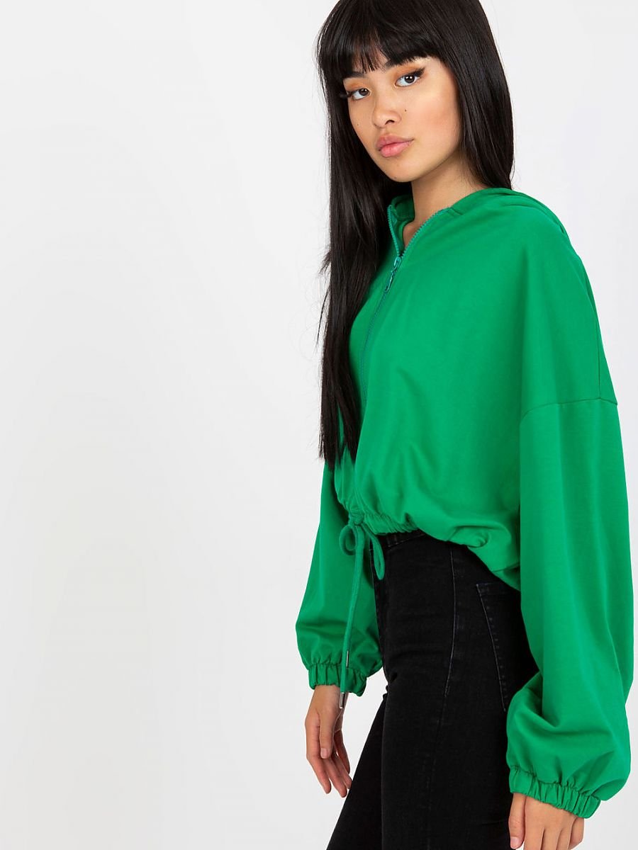 Krótka bluza damska z długim rękawem, zapinana na zamek. Bluza z kapturem, u dołu troczki do wiązania.