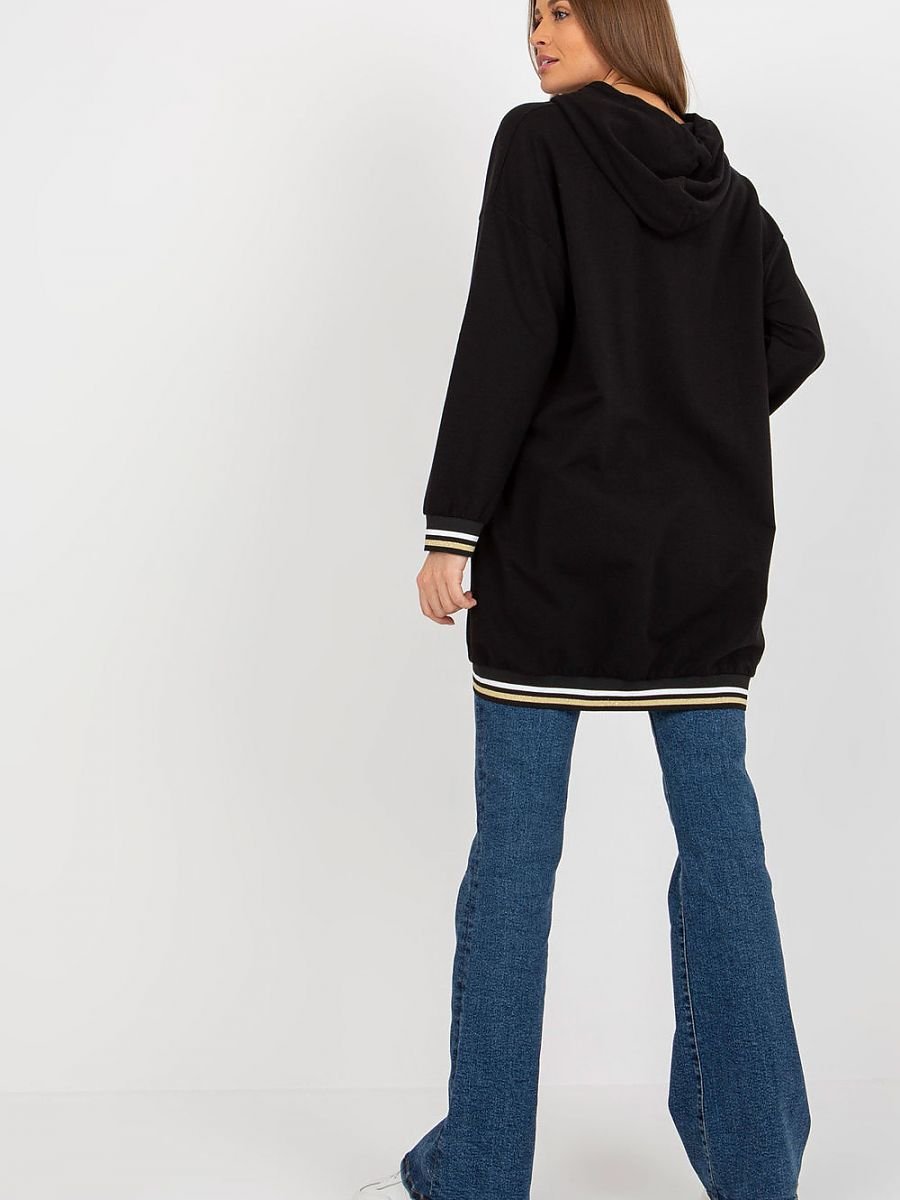 Bluza damska o przedłużonym kroju z długim rękawem oraz kapturem. Bluza zapinana na zamek, na przodzie duże kieszenie wsuwane.