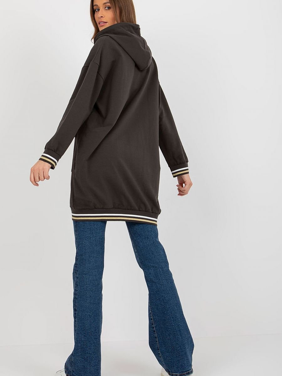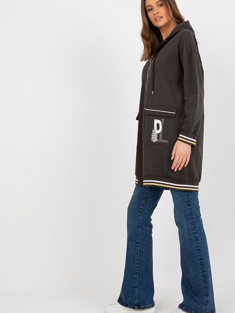 Bluza damska o przedłużonym kroju z długim rękawem oraz kapturem. Bluza zapinana na zamek, na przodzie duże kieszenie wsuwane.