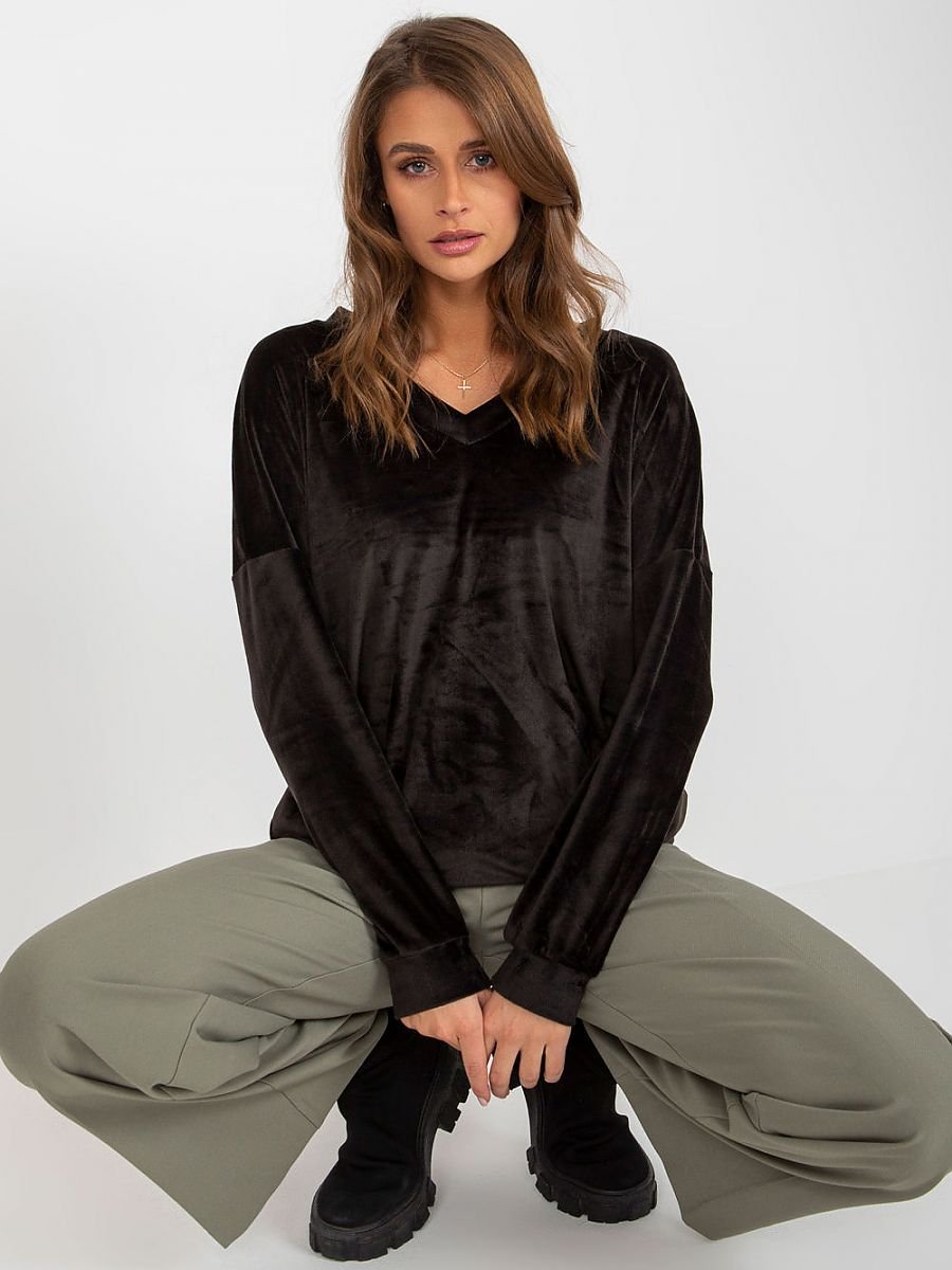 Ta welurowa bluza to idealna propozycja na codzienną stylizację w stylu casual. Wykonana z miękkiego materiału, zapewnia wygodę i przyjemne uczucie na skórze. Gładki wzór sprawia, że jest uniwersalna i pasuje do różnych stylizacji. Jej standardowa długość oraz długi rękaw sprawiają, że jest odpowiednia na wiele okazji. Dekolt w kształcie litery V nadaje bluzie elegancji i subtelności. To doskonały wybór na chłodniejsze dni, kiedy chcesz czuć się wygodnie i jednocześnie prezentować się modnie.