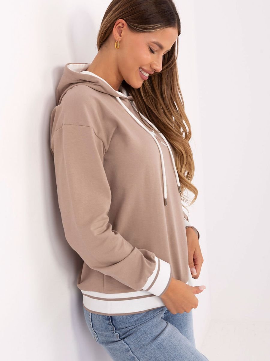 Damska bluza o casualowym charakterze, wykonana z dominującej mieszanki bawełny i elastanu, gwarantującej wygodę oraz swobodę ruchów. Model o standardowej długości posiada długie rękawy zakończone kontrastowymi ściągaczami, które powtarzają się również u dołu, nadając bluzie nowoczesny wygląd. Wyposażona w praktyczny kaptur z troczkami, doskonale sprawdzi się na codzienne okazje. Gładka powierzchnia materiału została urozmaicona haftem na przodzie, który dodaje całości stylowego akcentu. Bluza nie posiada zapięcia, co podkreśla jej luźny i wygodny charakter.