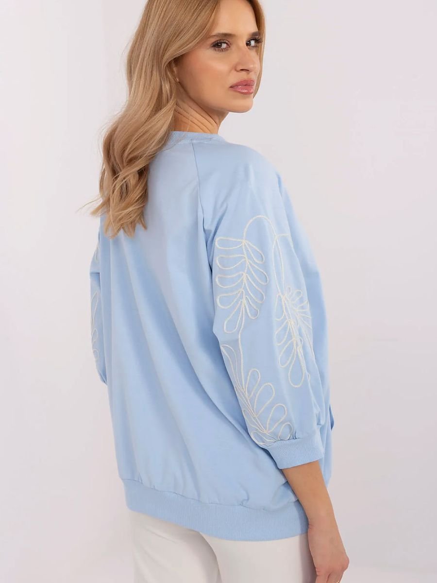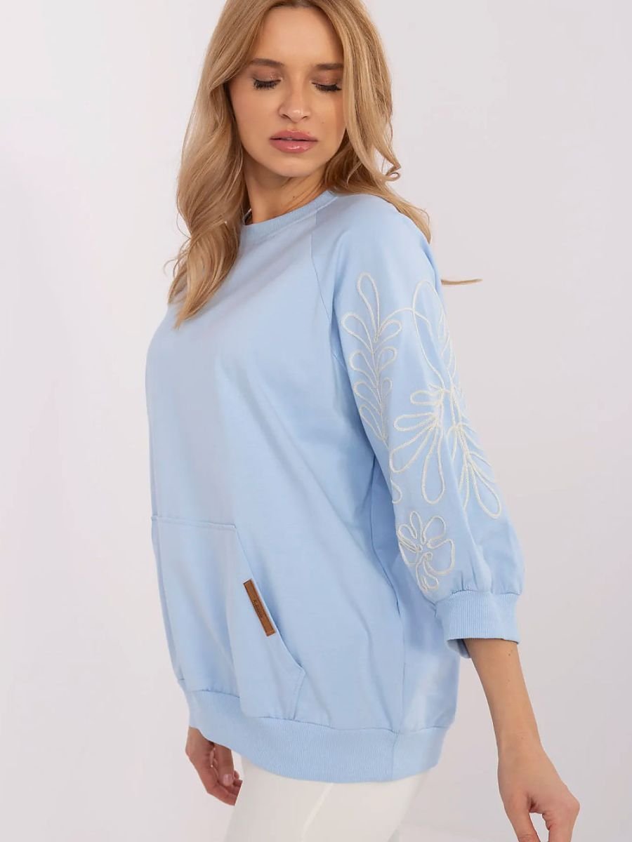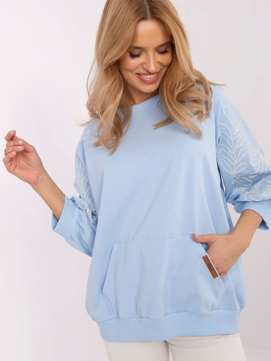 Damska bluza w stylu casual, idealna na co dzień i do pracy. Wykonana z miękkiego, przyjemnego w dotyku materiału, zapewnia komfort noszenia przez cały dzień. Oryginalnym akcentem jest dekoracyjny haft na rękawach, który dodaje jej subtelnej elegancji. Model z rękawem 3/4 to świetny wybór na różne pory roku. Bluza posiada praktyczną kieszeń typu kangurek na przodzie, co podkreśla jej swobodny, miejski charakter. Doskonała do stylizacji ze spodniami lub spódnicą, łącząc wygodę z modnym wyglądem.