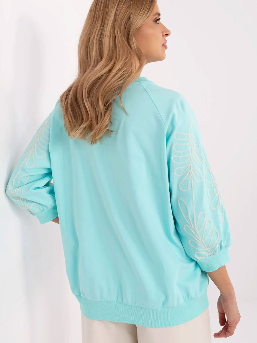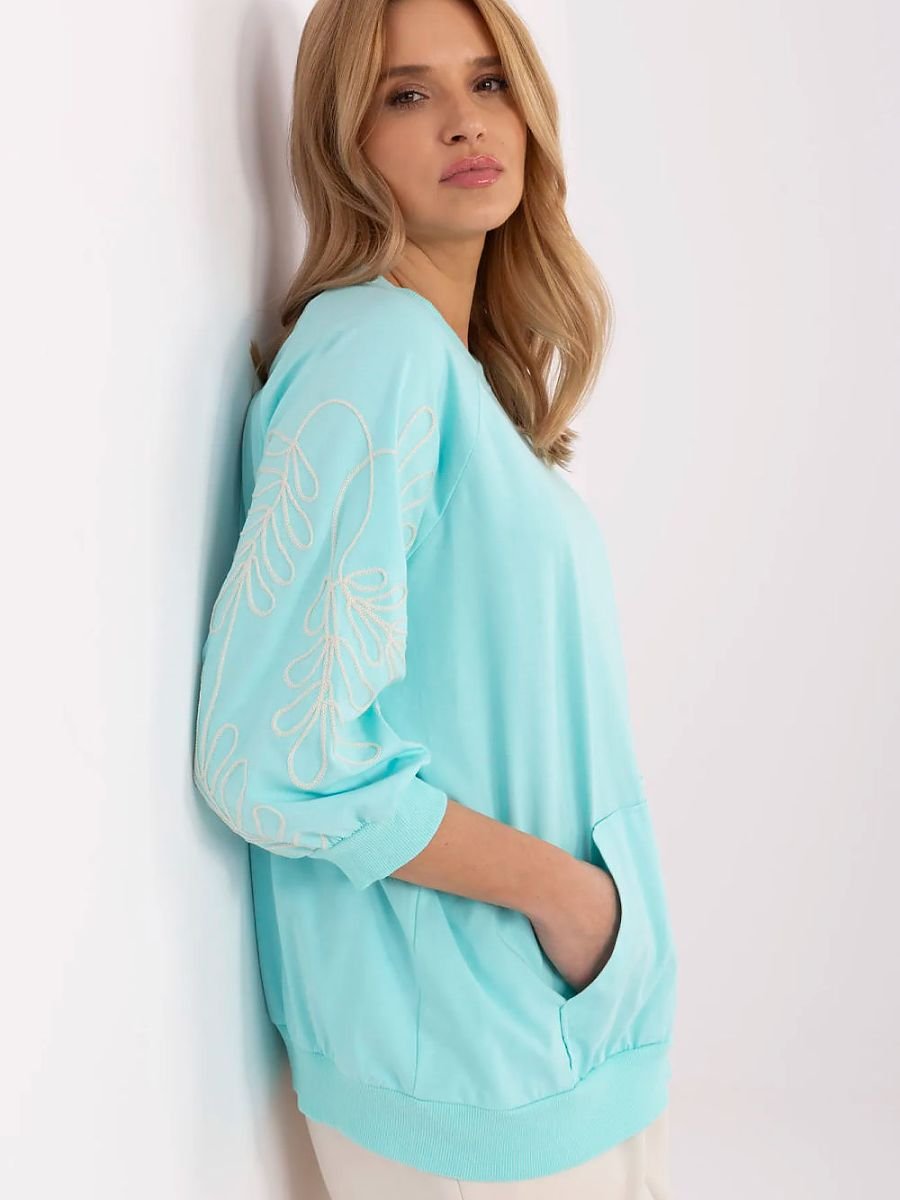 Damska bluza w stylu casual, idealna na co dzień i do pracy. Wykonana z miękkiego, przyjemnego w dotyku materiału, zapewnia komfort noszenia przez cały dzień. Oryginalnym akcentem jest dekoracyjny haft na rękawach, który dodaje jej subtelnej elegancji. Model z rękawem 3/4 to świetny wybór na różne pory roku. Bluza posiada praktyczną kieszeń typu kangurek na przodzie, co podkreśla jej swobodny, miejski charakter. Doskonała do stylizacji ze spodniami lub spódnicą, łącząc wygodę z modnym wyglądem.