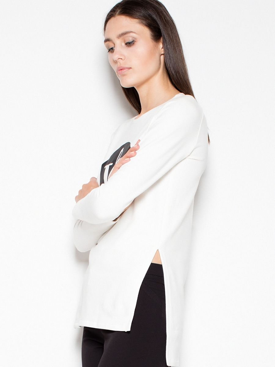 Asymetryczna, taliowana bluza z oryginalnym nadrukiem. Po bokach modelu znajdują się rozcięcia. Świetna do codziennych stylizacji.