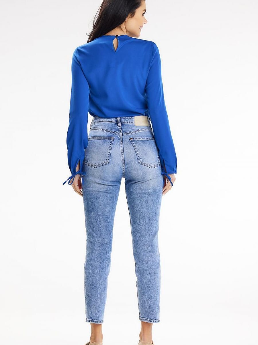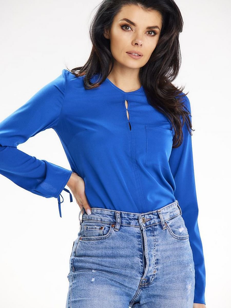 Casualowa bluzka z długim rękawem wiązanym na dole. Z tyłu bluzki zapięcie na guzik. Produkt posiada kieszonkę z przodu po lewej stronie oraz ozdobne rozcięcia przy dekolcie. To dobry wybór zarówno do spódnicy jak i jeansów, dzięki czemu można wybrać ją do pracy w biurze jak i wyjście na kolację.