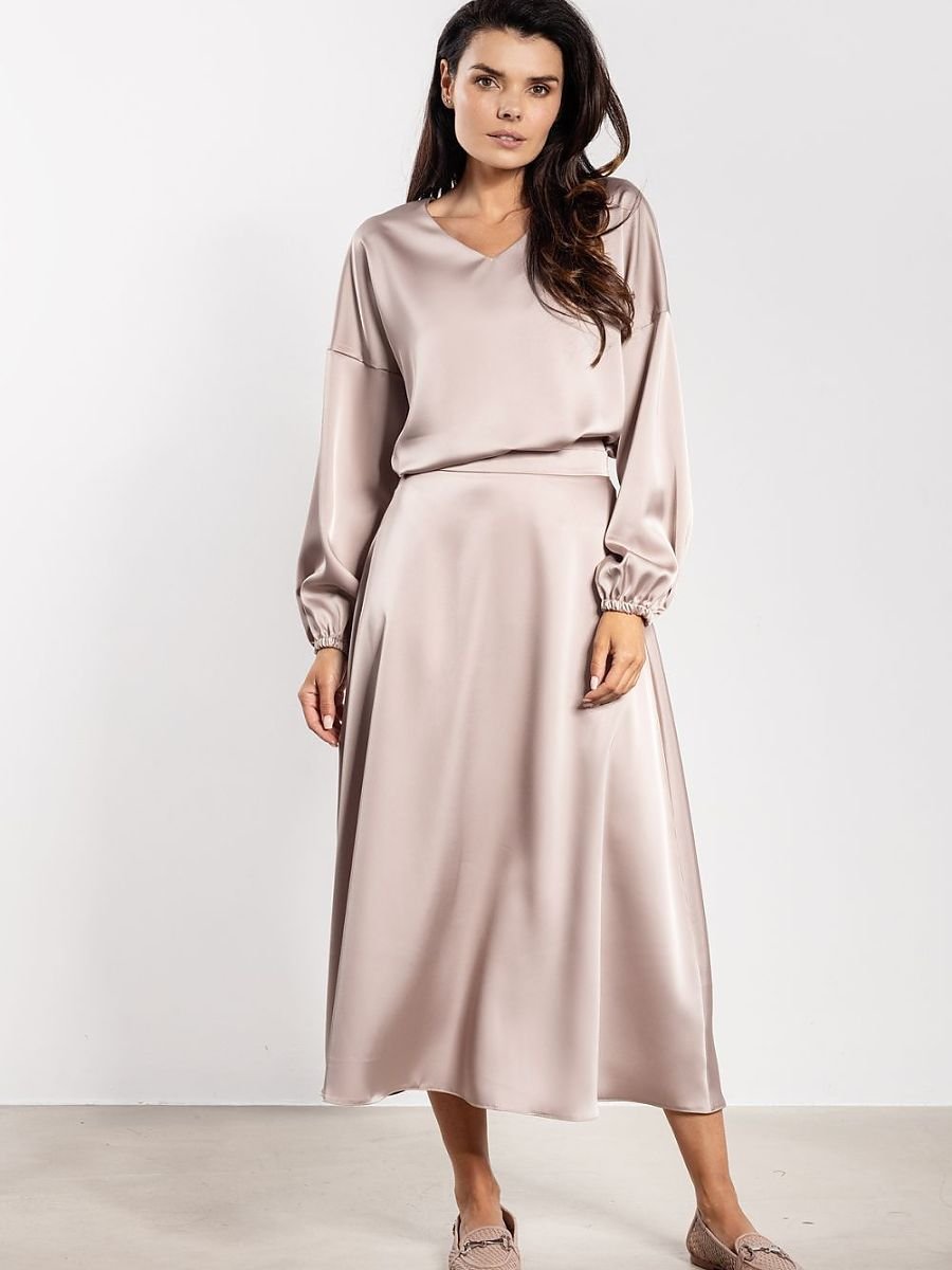 Elegancka satynowa bluzka o luźnym kroju łączy komfort z szykiem. Delikatny połysk tkaniny sprawia, że świetnie prezentuje się zarówno na co dzień, jak i podczas wyjątkowych okazji. Dekolt w kształcie litery V subtelnie wysmukla szyję i podkreśla kobiecość, a luźny fason gwarantuje wygodę noszenia. Długie rękawy zakończone subtelnym marszczeniem przy mankiecie nadają całości lekkości i elegancji.