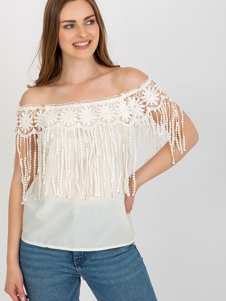 Letnia bluzka z dekoltem w stylu hiszpańskim. Bluzka obszyta ozdobną koronką z frędzelkami.