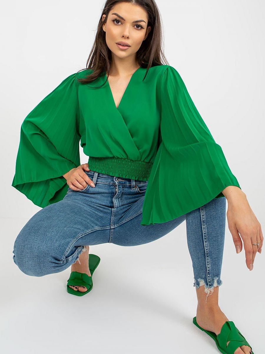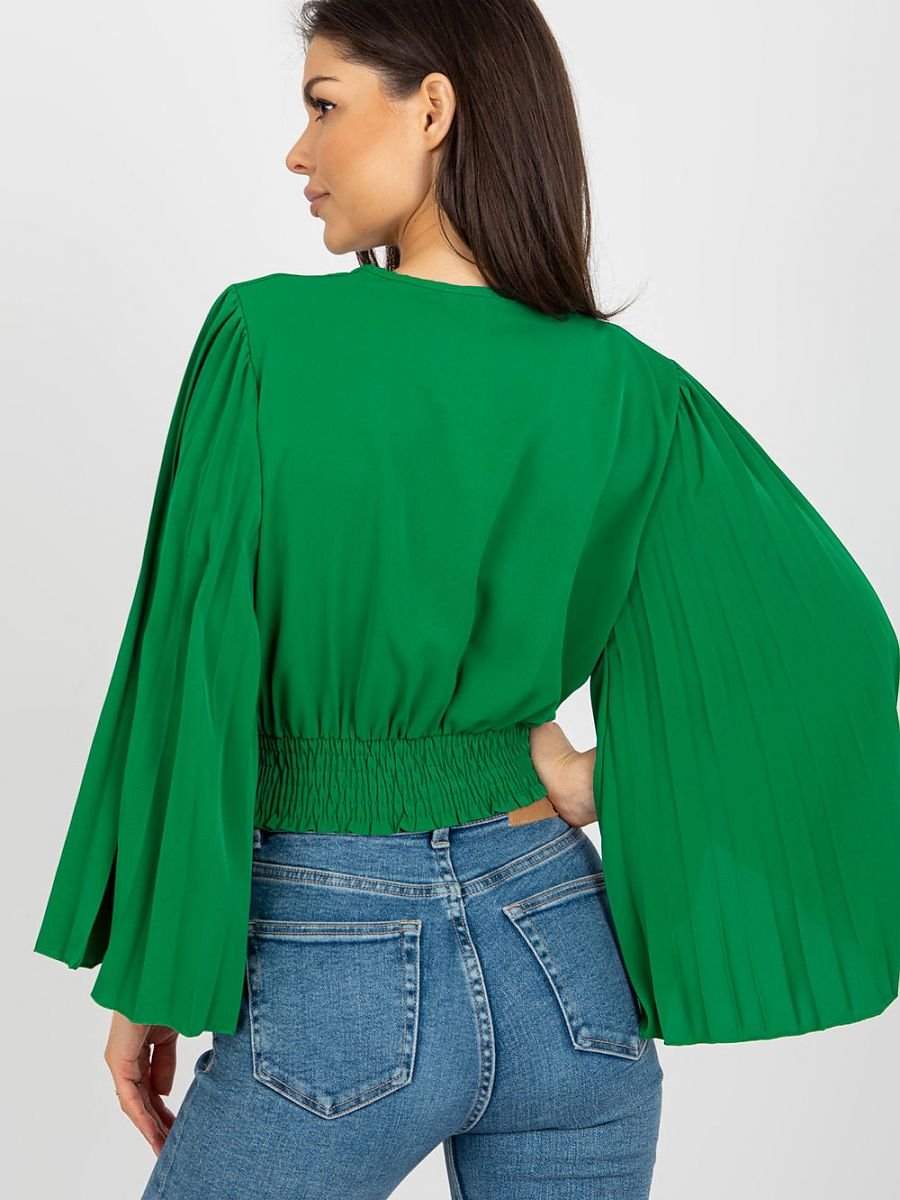 Bluzka z kopertowym dekoltem oraz długim szerokim rękawem. Rękawy w całości plisowane, u dołu bluzki szeroka guma podtrzymująca.