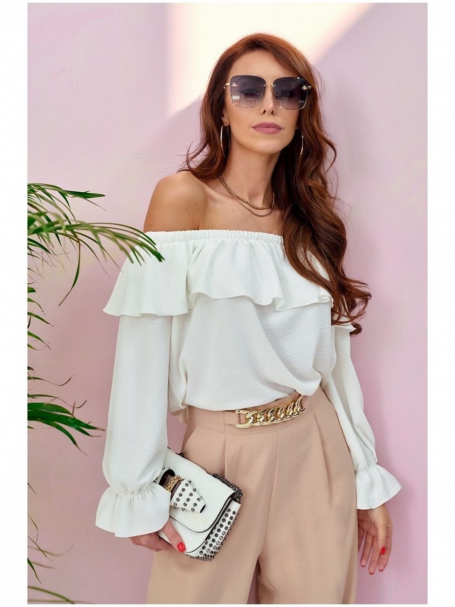 Bluzka hiszpanka z falbanami wykonana jest z gładkiej tkaniny, która jest delikatna i przyjemna w dotyku, dzięki czemu będzie ona wygodna w użytkowaniu. Bluzka posiada gumkę przy dekolcie, która hamuje spadanie z ramion. Doszyta falbana nadaje lekkości, a szerokie rękawy dodają jej oryginalności. Bluzka z odkrytymi ramionami będzie idealnym wyborem dla Pań lubiących sportowy styl oraz dla tych, które cenią sobie elegancki wygląd. Dopełnieniem stylizacji będą dobrze dobrane dodatki, ponieważ to dzięki nim bluzka będzie elegancka lub sportowa. Jednolite kolory i ich bardzo bogata gama pozwalają na stworzenie wymarzonego wyglądu. Produkt jest wyprodukowany i uszyty w Polsce.