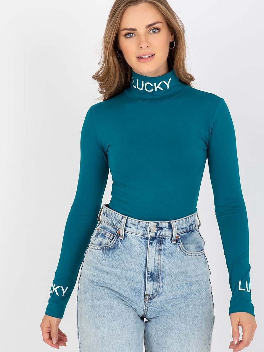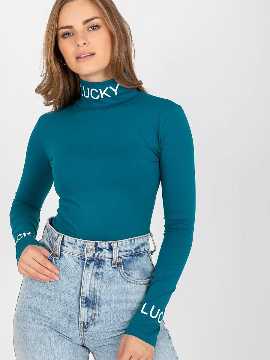 Bawełniana bluzka z długim rękawem oraz golfem. Bluzka o dopasowanym kroju, na golfie i rękawach kontrastowe napisy.