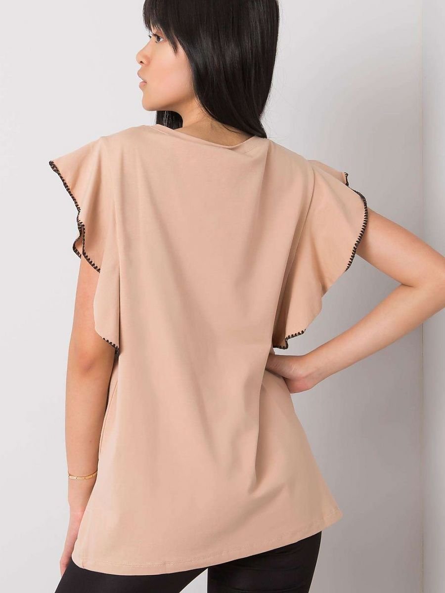 Prosta bluzka z krótkim rękawkiem w formie falbanki oraz okrągłym dekoltem. Idealna propozycja na wiele okazji.