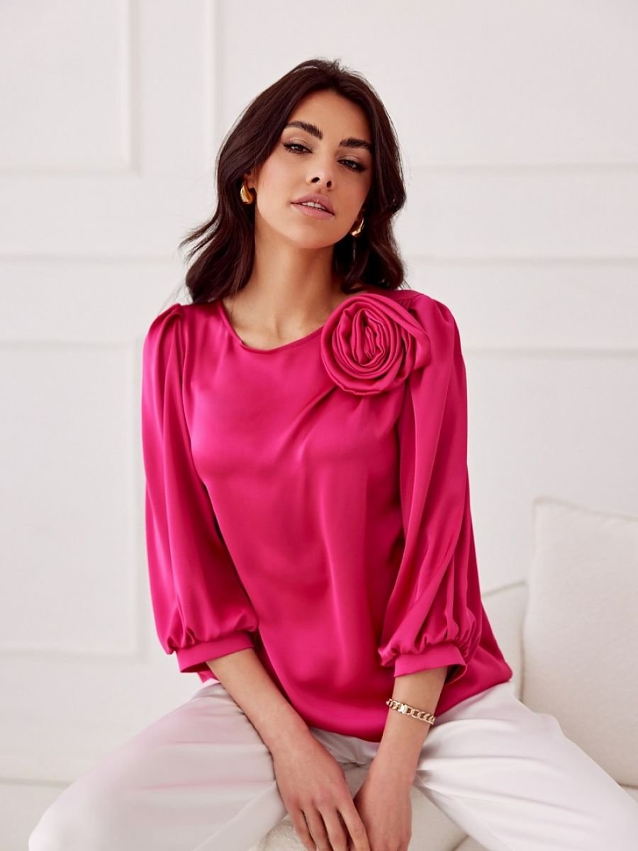 Bluzka Giana to elegancka propozycja uszyta z wysokiej jakości satynowej tkaniny, która delikatnie odbija światło, dodając stylizacji subtelnego blasku. Uwagę przyciąga okrągły dekolt ozdobiony efektowną różą, dekoracyjnym akcentem, który wyróżnia ten model i nadaje mu wyjątkowego charakteru. Szerokie rękawy 3/4 o bufiastej formie podkreślają ramiona, dodając bluzce lekkości i kobiecego wdzięku. Luźny fason gwarantuje wygodę i pełną swobodę ruchów, co czyni ten model nie tylko stylowym, ale i funkcjonalnym. Giana doskonale sprawdzi się jako element eleganckich zestawień, wystarczy połączyć ją z długimi, satynowymi spodniami Elsa, prostą marynarką i klasycznymi szpilkami, by stworzyć szykowny look na specjalne okazje. To idealny wybór na rodzinne uroczystości, święta, przyjęcia czy inne wydarzenia, podczas których chcesz wyglądać z klasą i czuć się komfortowo.