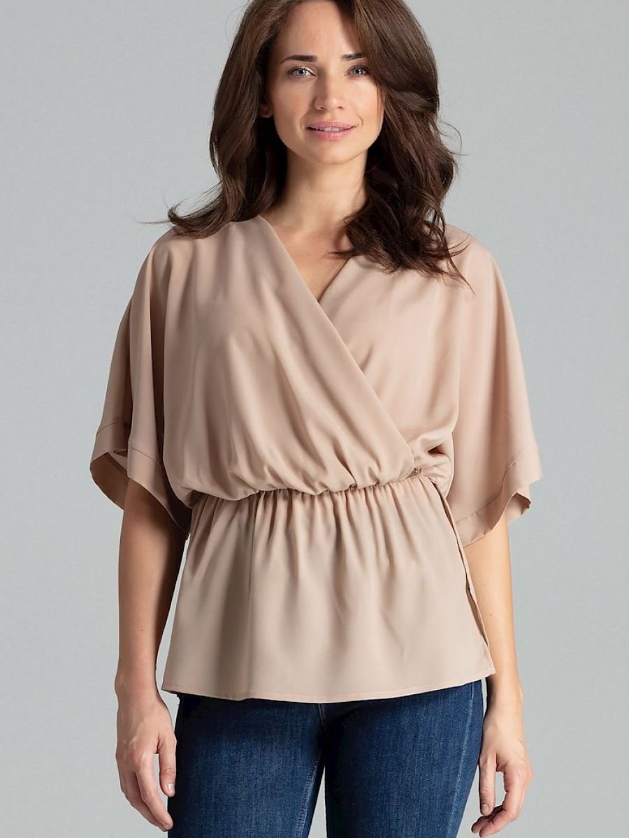 Beżowa prosta, luźna bluzka z krótkim kimonowym rękawem zakończonym mankietem. Kopertowy dekolt. W pasie wszyta gumka. Bluzka swobodnie opadająca na biodra.