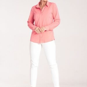 Fioletowa krótka prosta koszula z dekoltem w serek, zapinana z przodu na guziki, na dole koszuli ozdobne wiązanie. Krótki rękaw, marszczony w ramionach.
