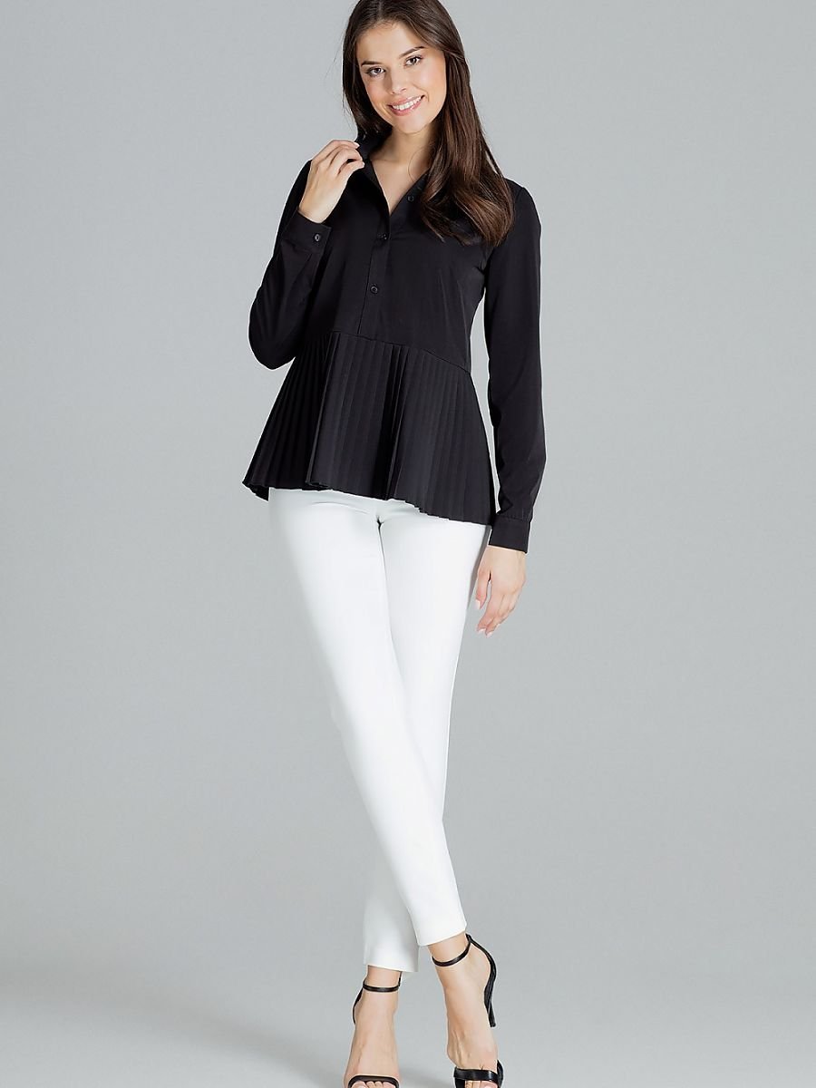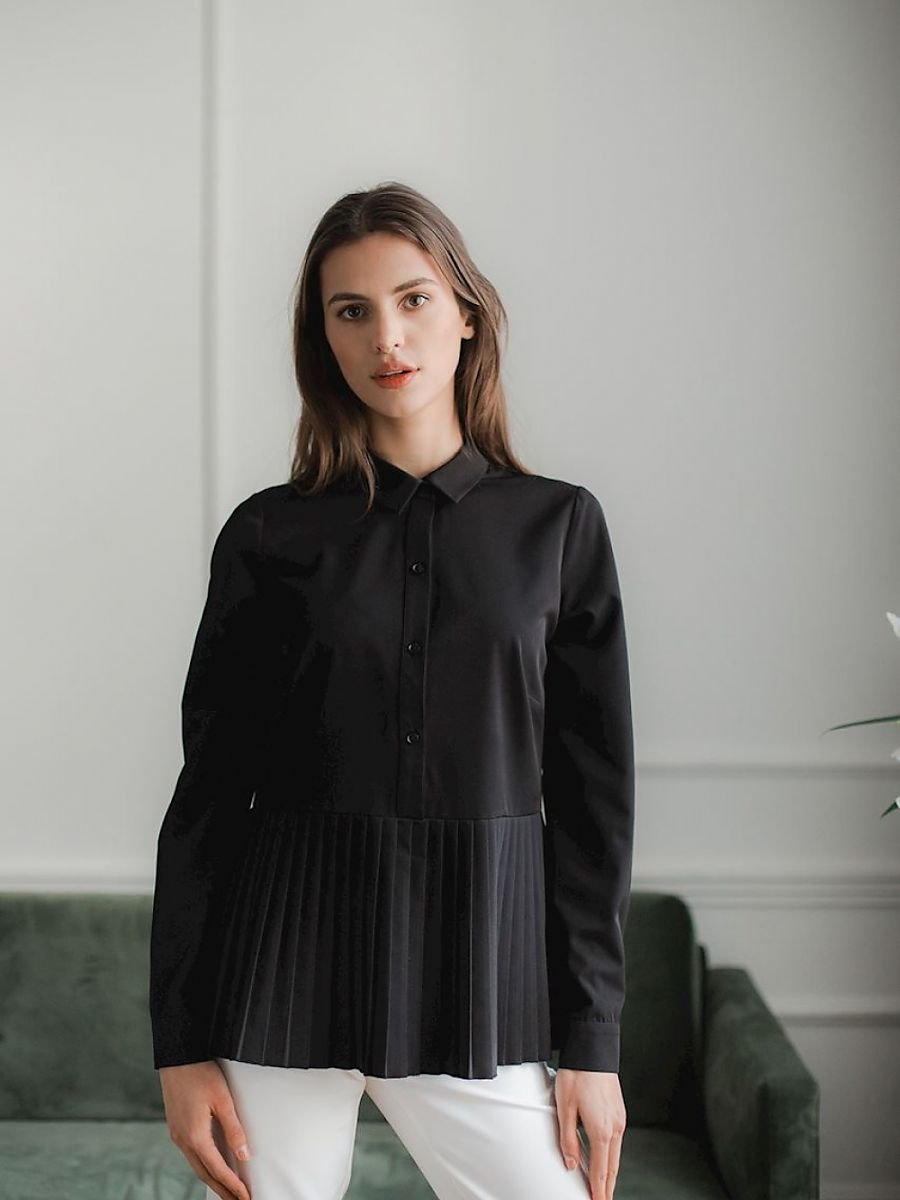 Czarna klasyczna elegancka bluzka z długim rękawem zakończonym mankietem, z kołnierzykiem. Zapinana do połowy na guziki. W dole bluzki doszyta ozdobna plisowana falbana.