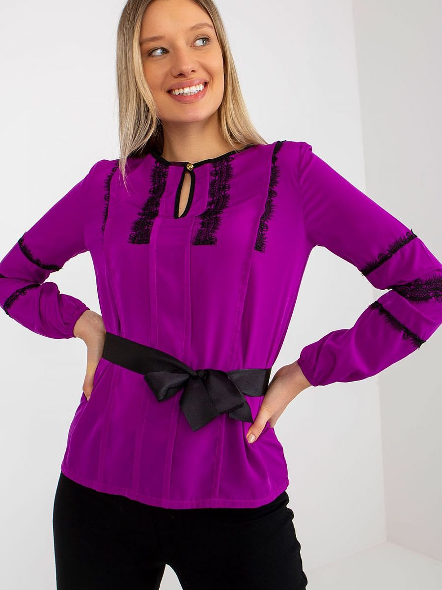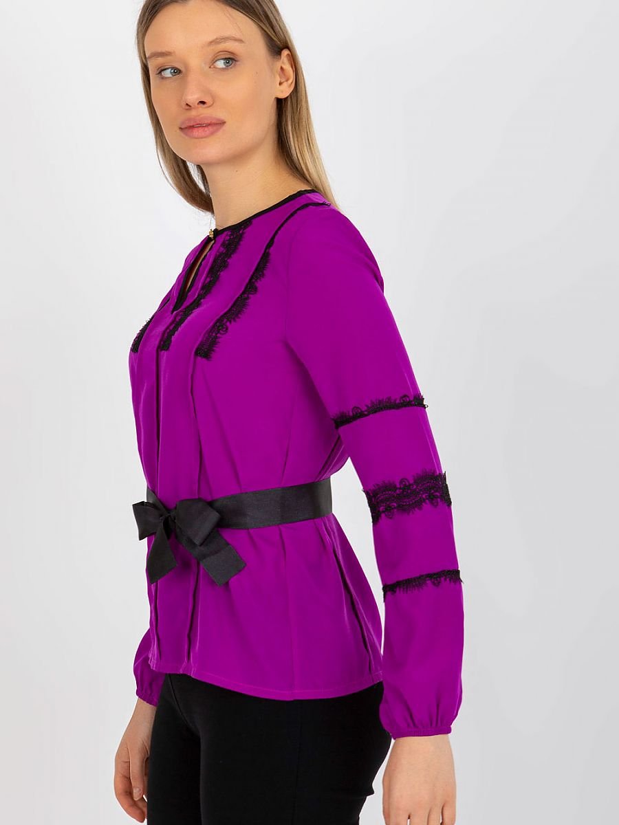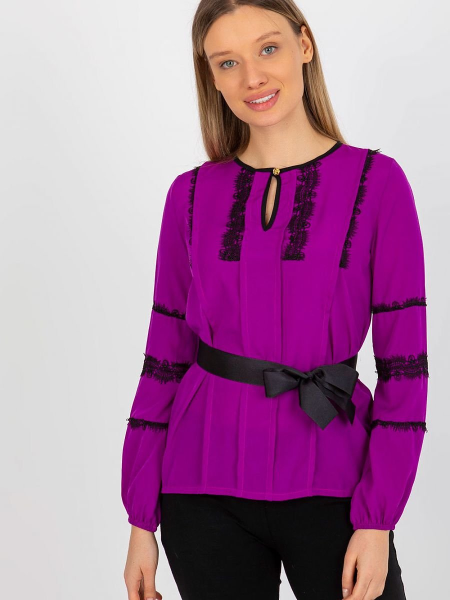 Bluzka wizytowa z długim rękawem oraz okrągłym dekoltem. Bluzka z naszytą koronką oraz paskiem do wiązania.