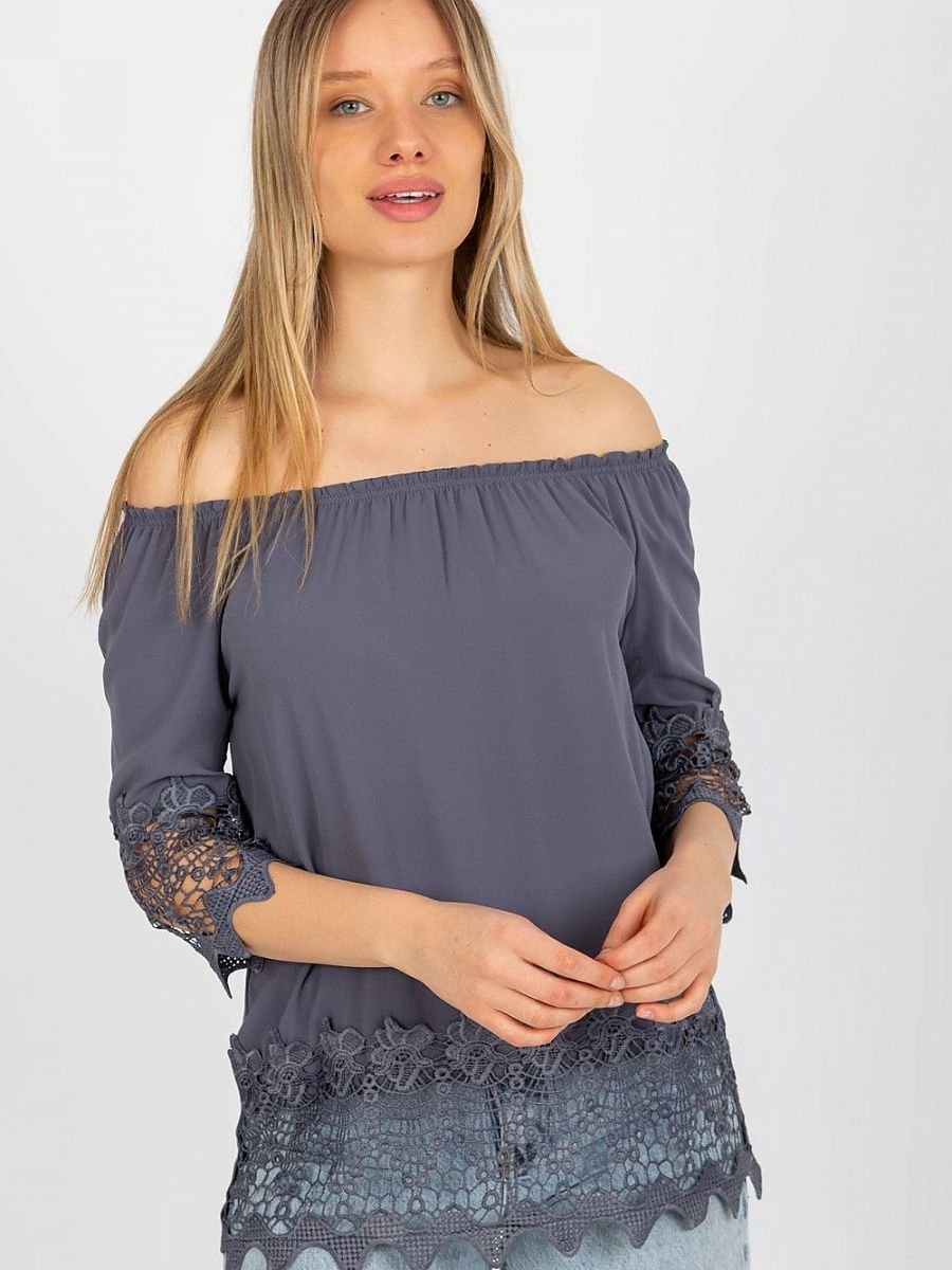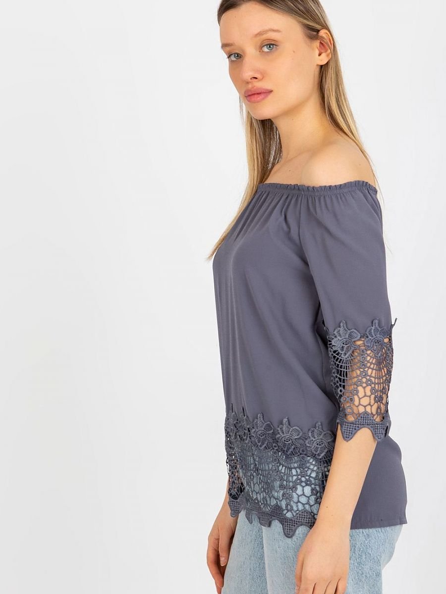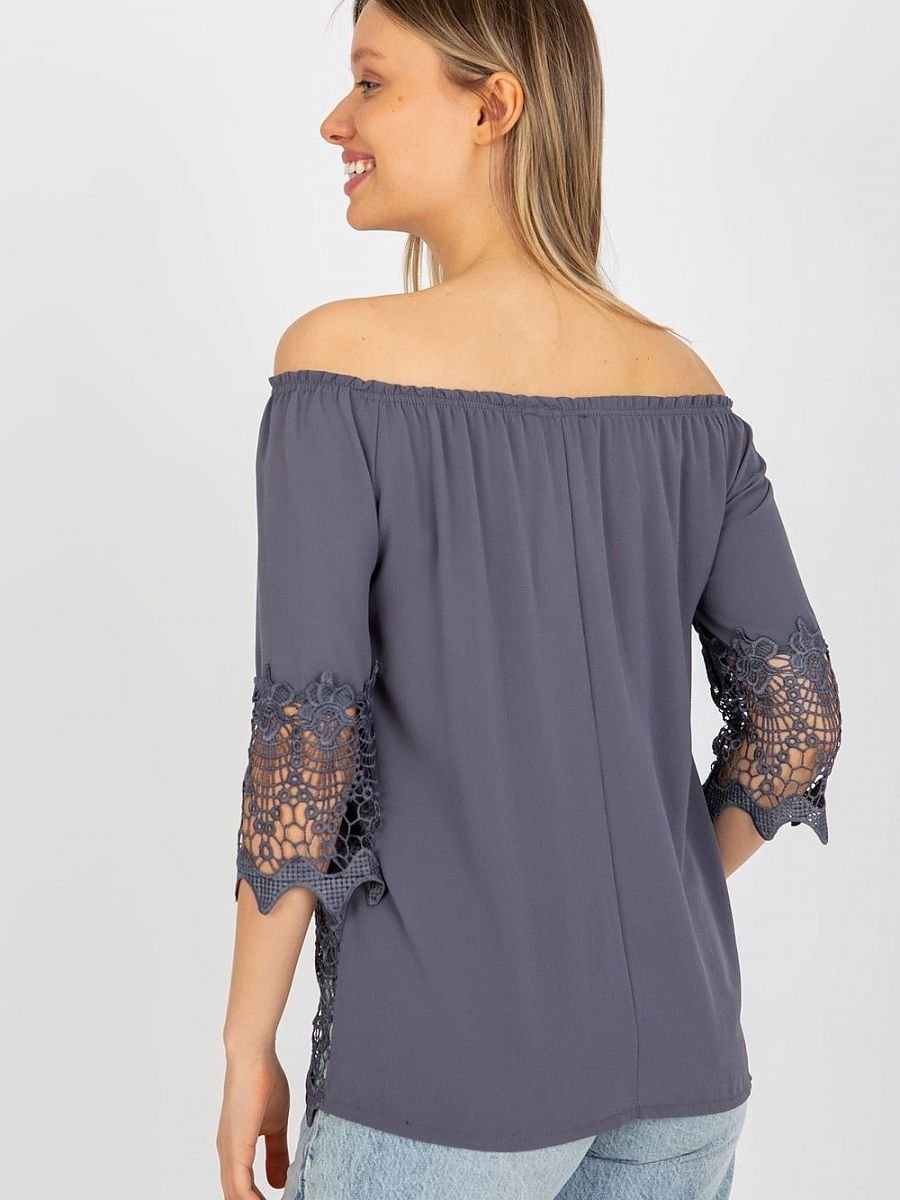 Bluzka z rękawem 3/4 oraz dekoltem w stylu hiszpańskim. Rękawy i dół bluzki z ozdobnym wykończeniem.