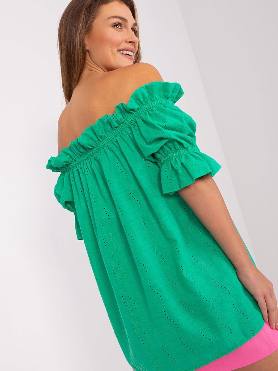 Bluzka z krótkim rękawkiem oraz dekoltem w stylu hiszpańskim. Bluzka z materiału z ażurowanym wzorem. Idealna na wiele okazji.