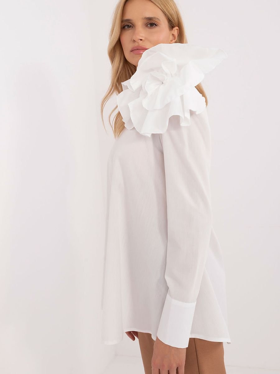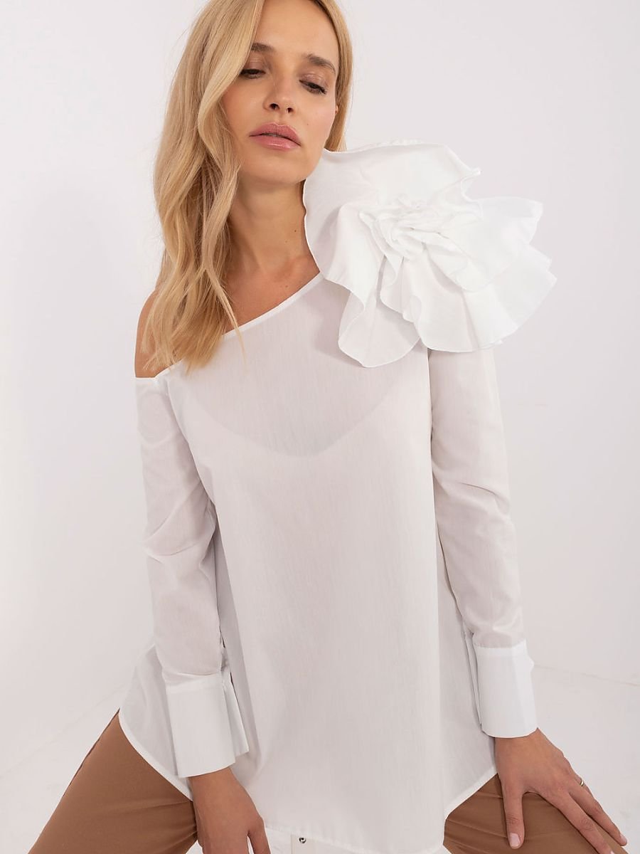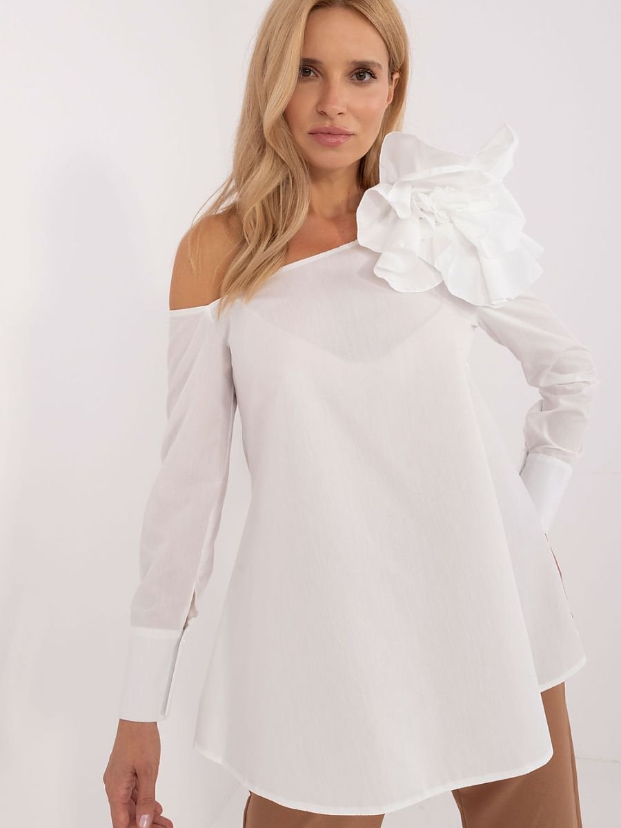 Elegancka bluzka z gładkiego, jednokolorowego materiału, idealna na wizytowe okazje oraz do pracy. Wykonana z wysokiej jakości bawełny, zapewnia komfort noszenia i elegancki wygląd. Ozdobny materiałowy kwiat w formie broszki na lewym ramieniu dodaje jej wyrafinowanego charakteru, czyniąc ją wyjątkową i stylową. Bluzka ma asymetryczny dekolt, co podkreśla nowoczesny design, a długi rękaw oraz standardowa długość czynią ją uniwersalnym elementem garderoby. Zapięcie na suwak z tyłu zapewnia wygodę i doskonałe dopasowanie. Idealny wybór dla kobiet ceniących klasyczną elegancję z oryginalnymi detalami.