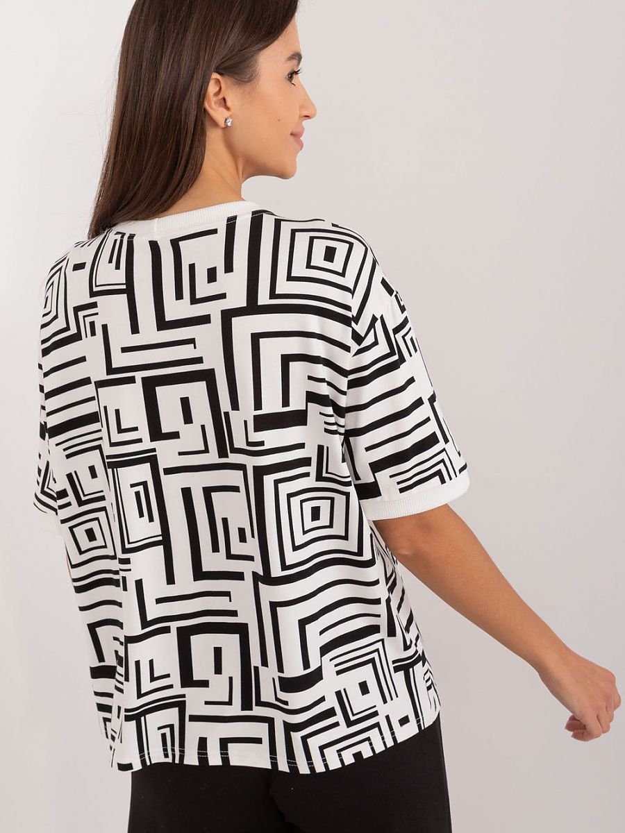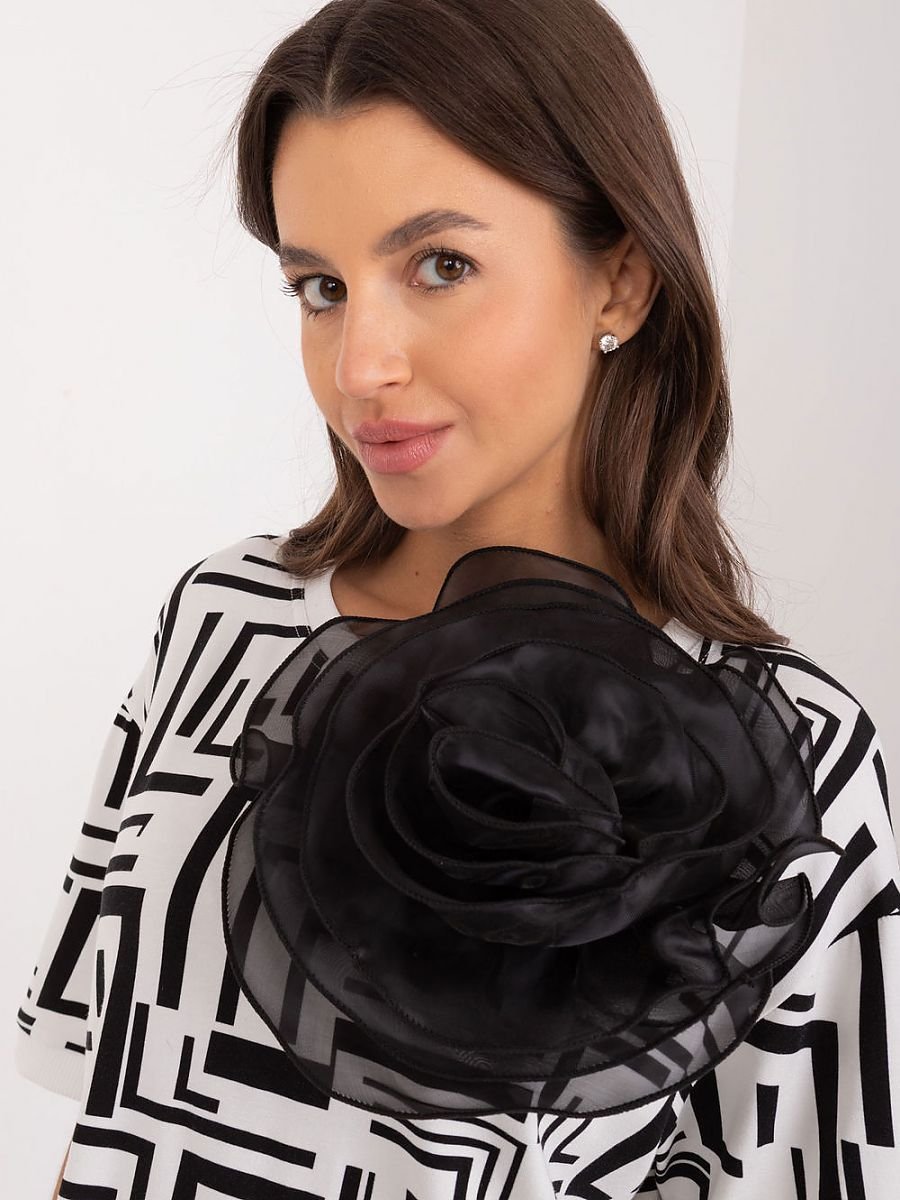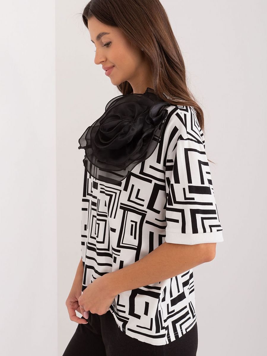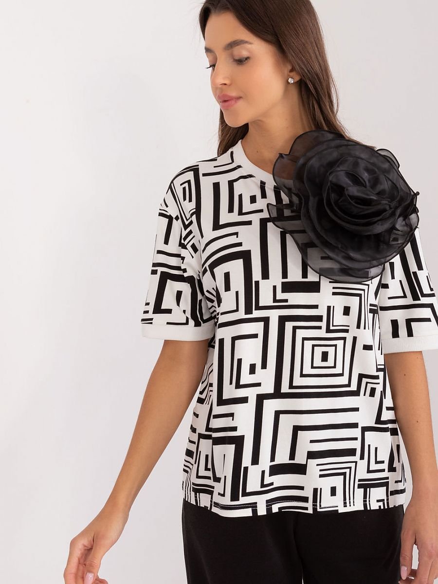 Poznaj elegancką bluzkę codzienną, która doskonale sprawdzi się zarówno w pracy, jak i podczas codziennych aktywności. Ta bluzka łączy w sobie klasyczny styl i nowoczesne detale, oferując komfort i modny wygląd. Bluzka zdobiona jest subtelną broszką w kształcie kwiatu, która dodaje jej uroku i elegancji, czyniąc ją wyjątkową. Nowoczesny geometryczny wzór przyciąga wzrok i dodaje bluzce stylowego charakteru, idealnie wpisując się w casualowy dress code. Standardowa długość bluzki, która doskonale pasuje do różnych stylizacji, zarówno z spodniami, jak i spódnicami. Krótkie rękawy sprawiają, że bluzka jest idealna na cieplejsze dni, zapewniając jednocześnie wygodę i swobodę ruchów. Klasyczny, okrągły dekolt, który dodaje bluzce uniwersalnego charakteru i pasuje do różnych typów sylwetek. Ta codzienna bluzka z ozdobną broszką w kształcie materiałowego kwiatu to doskonały wybór dla kobiet ceniących sobie styl i wygodę. Jej nowoczesny design i wysokiej jakości materiał sprawiają, że jest idealna na każdą okazję, od spotkań w pracy po codzienne wyjścia.