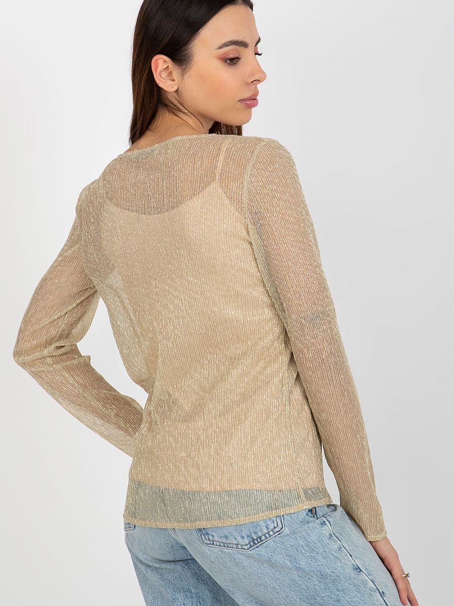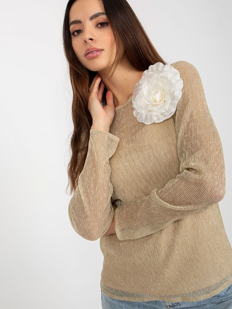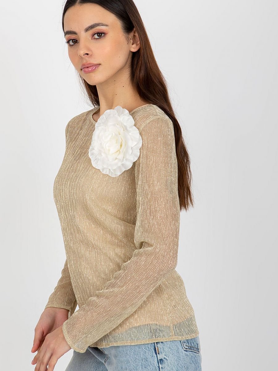 Dwuczęściowa bluzka z długim rękawem oraz okrągłym dekoltem. Na przodzie ozdobna broszka w kształcie kwiatka. Spodnia część w formie koszulki na ramiączkach.