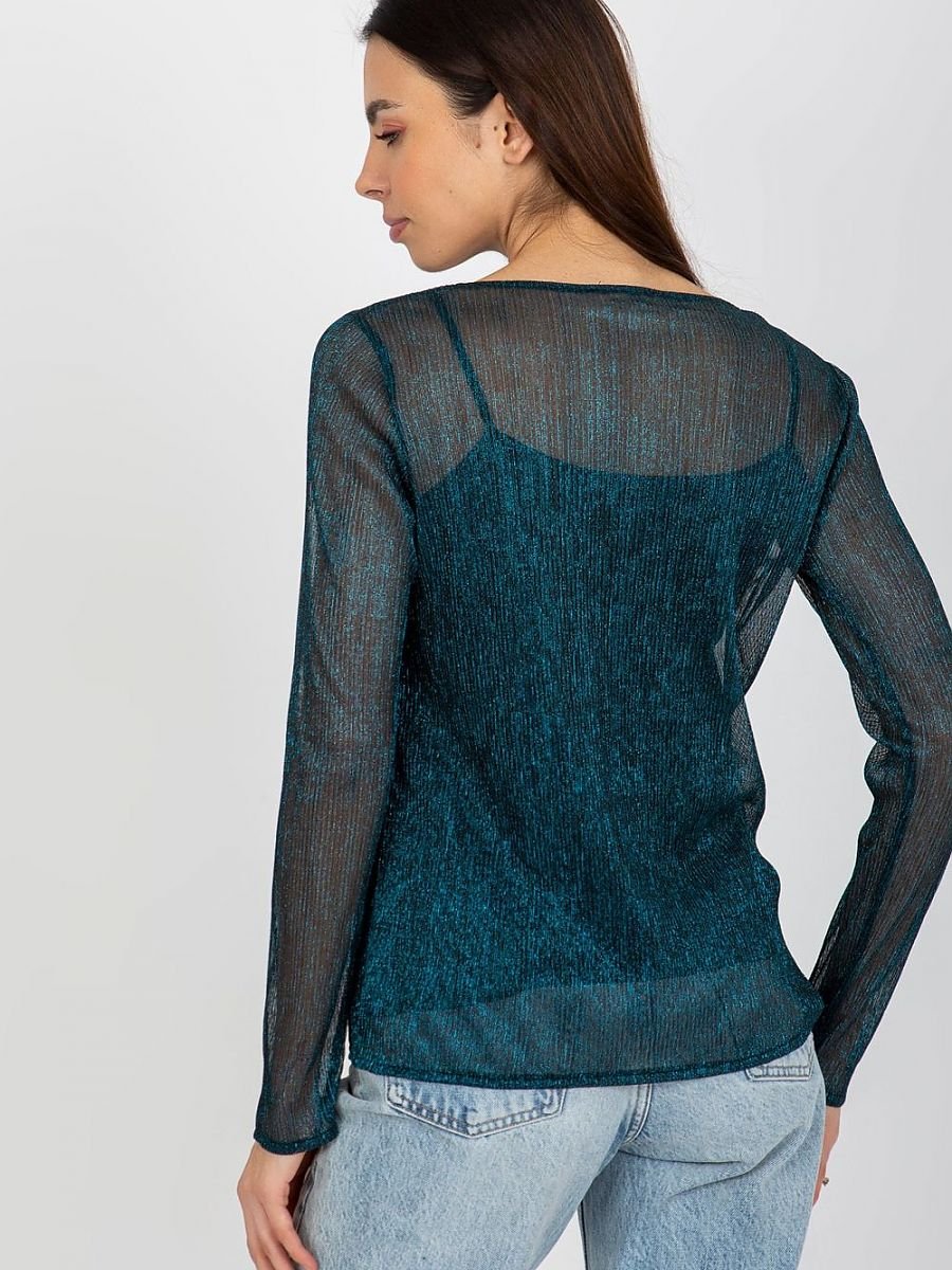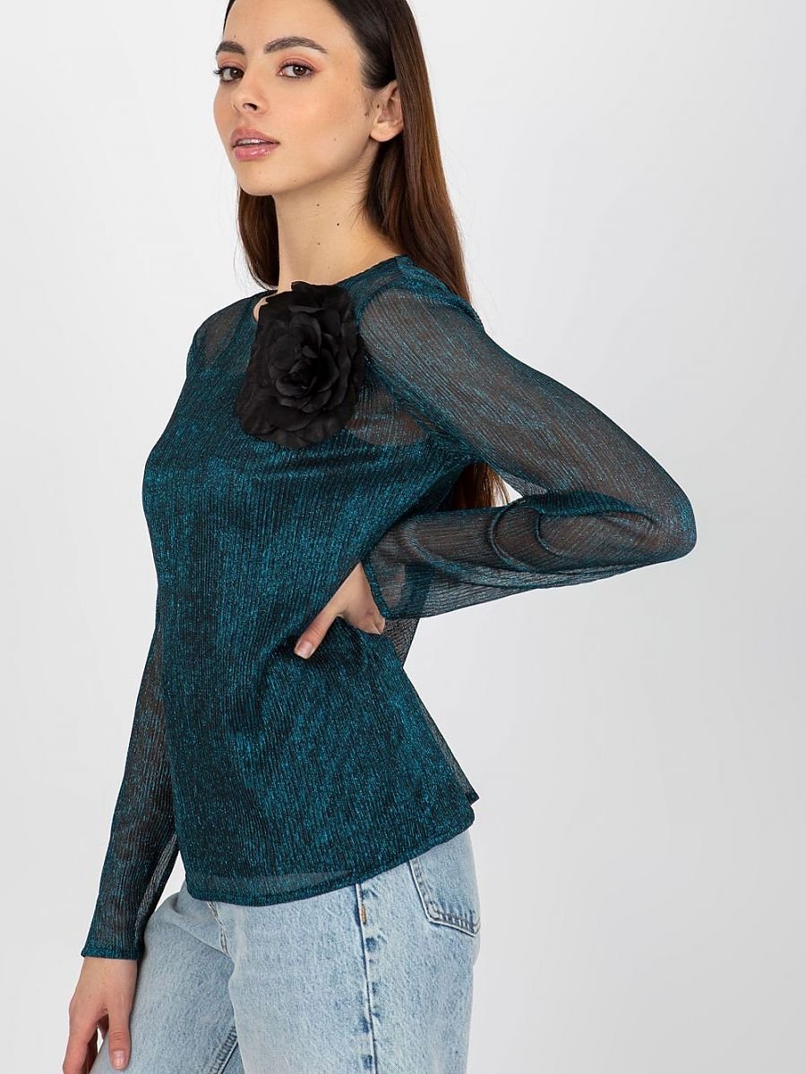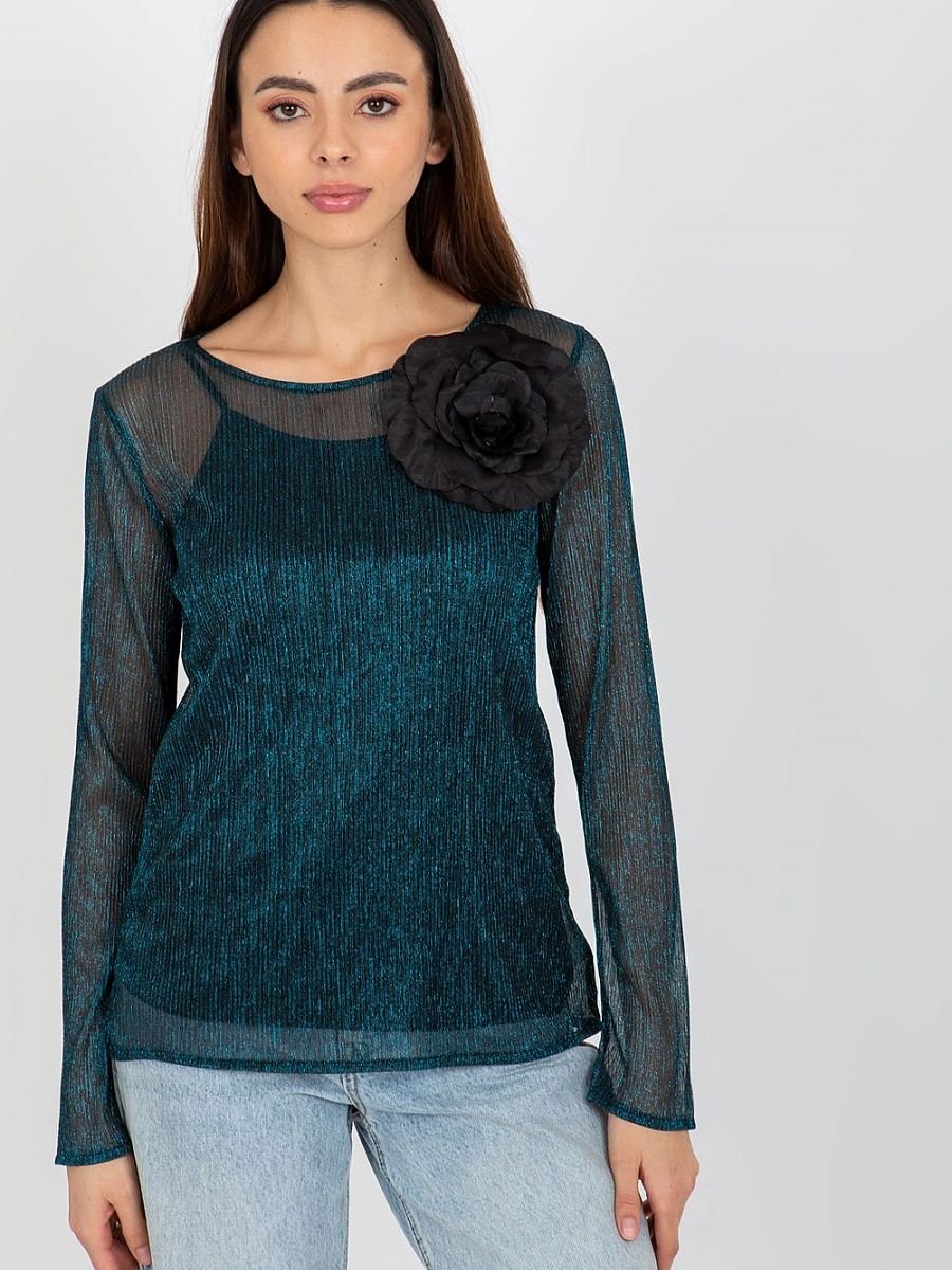 Dwuczęściowa bluzka z długim rękawem oraz okrągłym dekoltem. Na przodzie ozdobna broszka w kształcie kwiatka. Spodnia część w formie koszulki na ramiączkach.