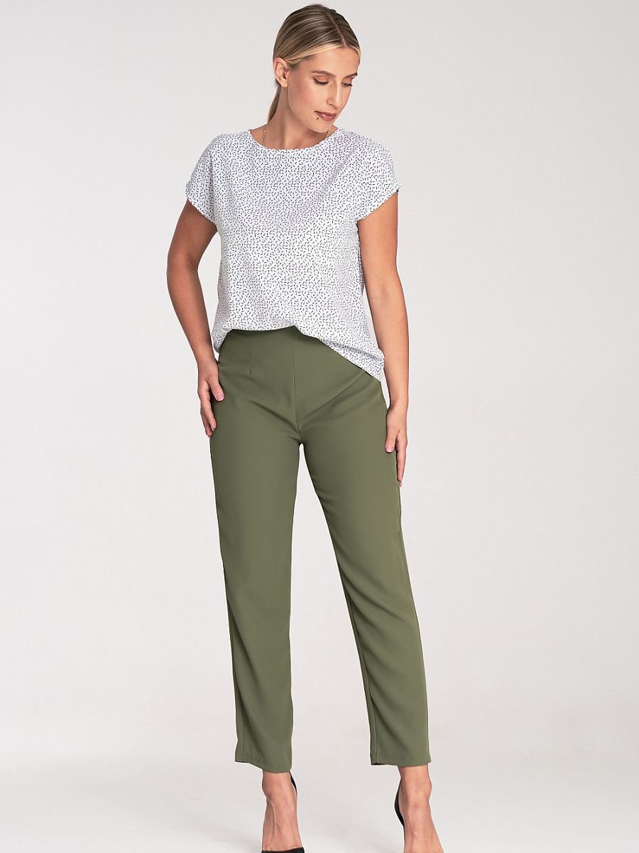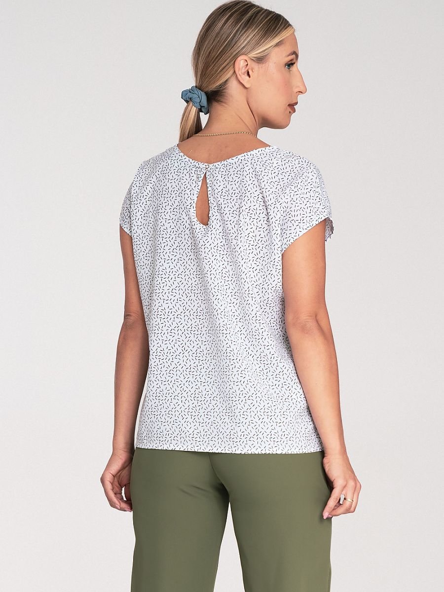 Bluzka o prostym kroju z krótkim rękawem. Bluzka posiada okrągły dekolt, na plecach zapięcie na napę.