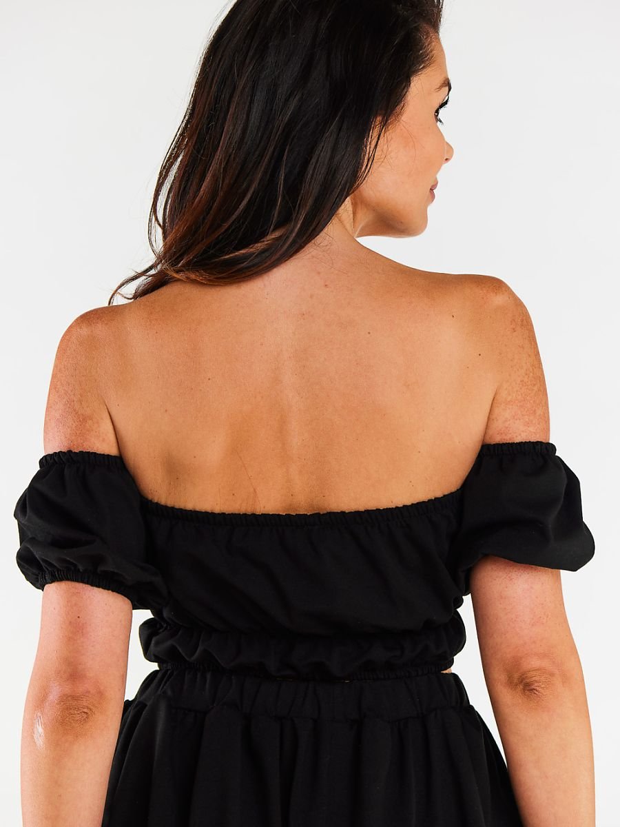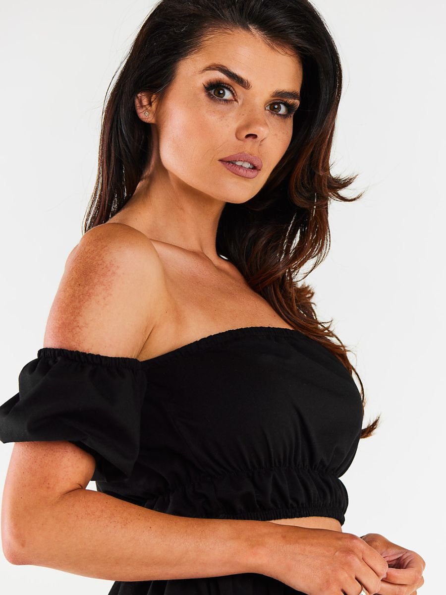 Krótka bluzka z krótkim rękawkiem i efektownym dekoltem hiszpańskim, który subtelnie odsłania ramiona. Wykończona elastycznymi gumkami w talii, rękawach i przy dekolcie, co zapewnia lepsze dopasowanie do sylwetki oraz komfort noszenia. Lekka i kobieca, idealna na letnie dni i wieczorne wyjścia.