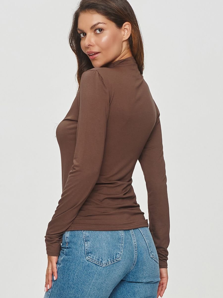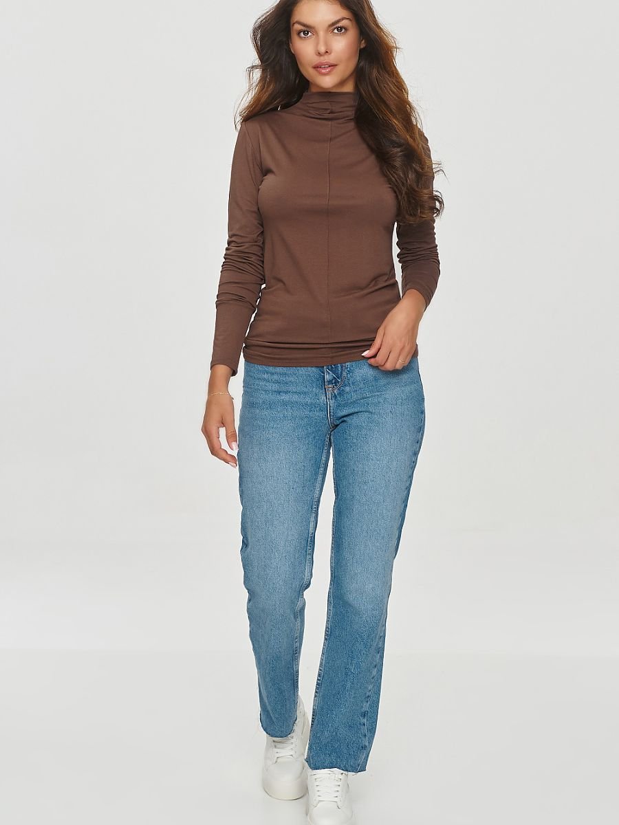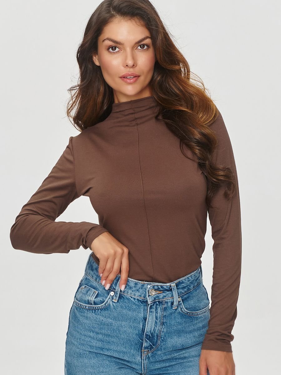 Uniwersalna bluzka damska wykonana z lekkiej przewiewnej wiskozy to klasyk w jesienno-zimowej garderobie. Model posiada wysoki golf i długie rękawy zapewniając funkcjonalność. Przeszycie na przodzie bluzki dodaje jej oryginalności i wyjątkowego charakteru. Model jest delikatnie dopasowany ale nie krępujący ruchów, dzięki elastycznemu materiałowi. Jego prosta forma stanowi doskonałe uzupełnienie wielu stylizacji zarówno casualowych jak i bardziej formalnych. Model idealny dla kobiet ceniących połączenie wygody, funkcjonalności i ponadczasowości.