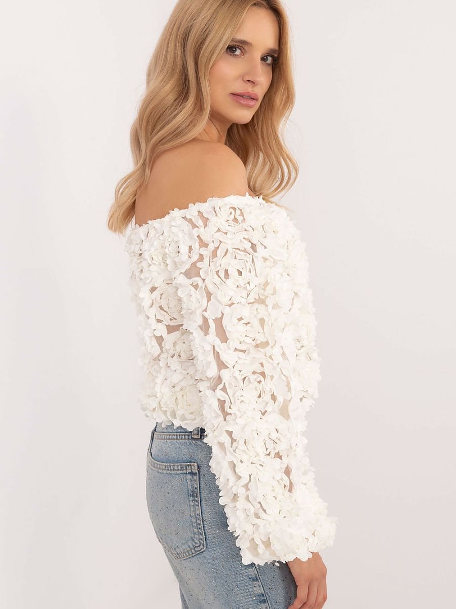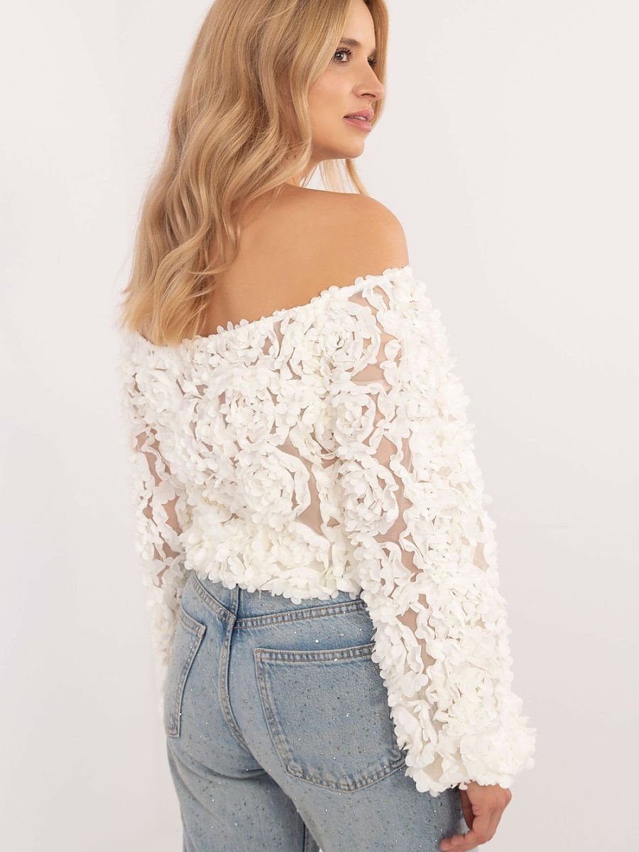 Elegancka bluzka o krótkiej długości, idealna na imprezy i wyjątkowe okazje, wyróżniająca się szykownym stylem. Bluzka ma delikatnie urozmaiconą fakturę materiału, co dodaje jej wyrafinowanego charakteru i subtelnej głębi. Wykonana z poliestru z dodatkiem elastanu, doskonale dopasowuje się do sylwetki, zapewniając komfort noszenia. Dekolt w stylu hiszpanki eksponuje ramiona, nadając bluzce kobiecości i lekkości, a długie rękawy dodają elegancji i tworzą idealną równowagę w kroju.