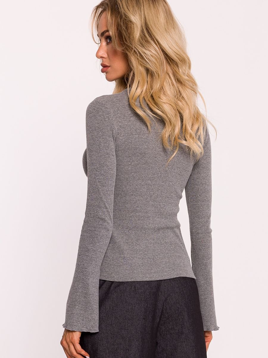 Dopasowana bluzka wykonana z prążkowanej dzianiny bawełnianej, idealna na codzienne stylizacje. Posiada długie rękawy, które są lekko poszerzone u dołu i wykończone dekoracyjnym obszyciem, dodającym subtelnej elegancji. Zaprojektowana i uszyta w Polsce, bluzka łączy w sobie komfort i styl.