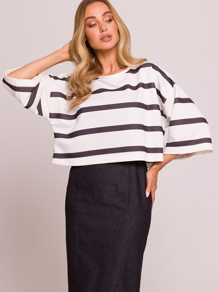 Krótka bluza oversize z dzianiny z nadrukiem w paski to idealna propozycja na codzienne stylizacje z nutą luzu. Charakteryzuje się szerokimi rękawami o długości 3/4, które dodają jej nietuzinkowego wyglądu, oraz dekoltem w kształcie łódki, który subtelnie eksponuje ramiona. Wykonana z miękkiej dzianiny, zapewnia wygodę i komfort noszenia przez cały dzień. Bluzka została zaprojektowana i uszyta w Polsce, co gwarantuje wysoką jakość i staranność wykonania. Idealna do zestawienia z jeansami, spódnicą lub sportowymi spodniami, nadaje się zarówno na casualowe, jak i bardziej eleganckie okazje.