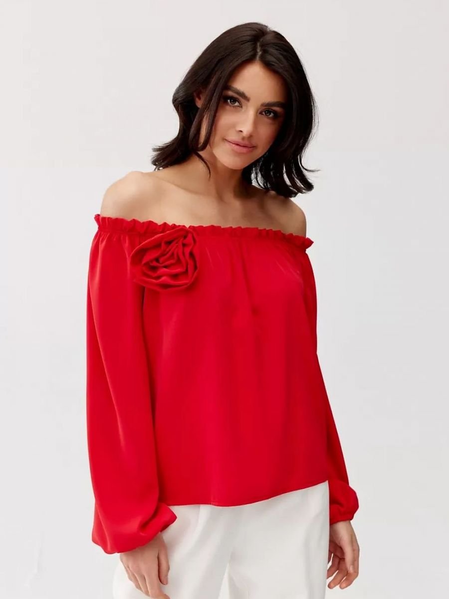 Rosie to elegancka bluzka wykonana z przyjemnego, satynowego materiału. Dekolt w stylu hiszpańskim nadaje bluzce lekkości i pięknie podkreśla ramiona, a wszyta gumka zapewnia komfort noszenia i idealne dopasowanie. Ozdobny element róży nadaje hiszpance charakteru i oryginalności. Długie, szersze rękawy zostały zakończone cienką gumką, która dodaje funkcjonalności. Satynowa bluzka hiszpanka doskonale sprawdzi się w uroczystych stylizacjach. Połączona z długimi spodniami lub spódnicą i klasycznymi szpilkami będzie doskonałym wyborem na komunie, święta, chrzciny i eleganckie wyjścia. Wybierz bluzkę Rosie jeśli zależy Ci na gustownym wyeksponowaniu ramion i dekoltu.
