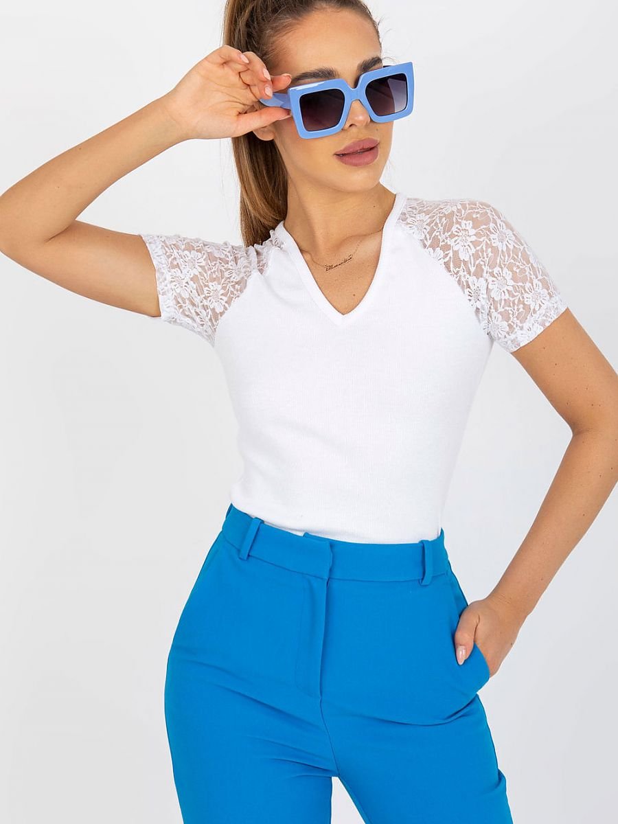 Bluzka z krótkim rękawkiem oraz dekoltem w serek. Rękawki z koronka nadają elegancji tej propozycji.